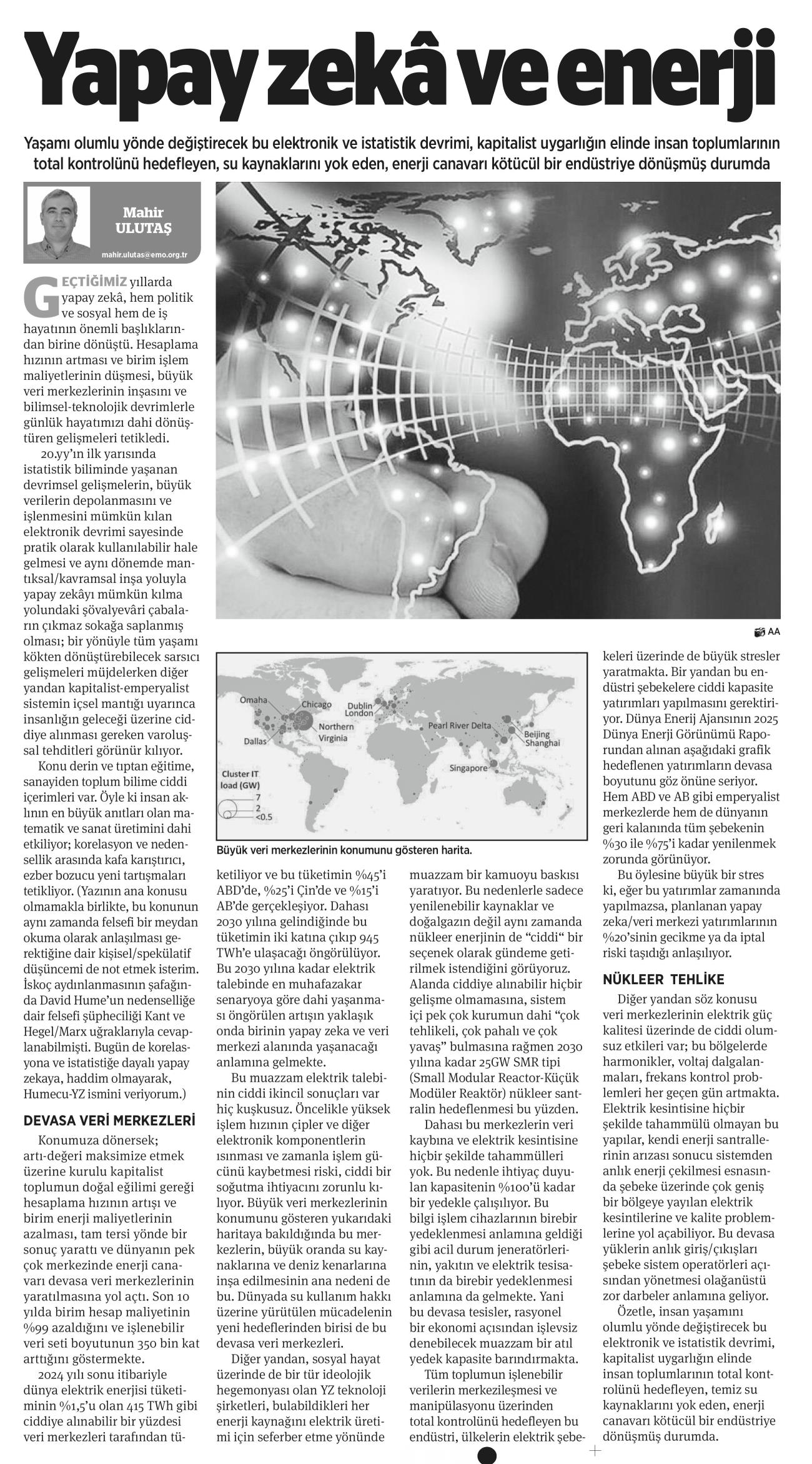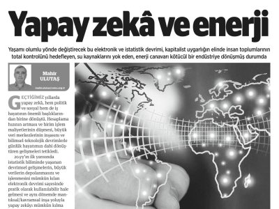 Geçtiğimiz yıllarda yapay zekâ, hem politik ve sosyal hem de iş hayatının önemli başlıklarından birine dönüştü. Hesaplama hızının artması ve birim işlem maliyetlerinin düşmesi, büyük veri merkezlerinin inşasını ve bilimsel-teknolojik devrimlerle günlük hayatımızı dahi dönüştüren gelişmeleri tetikledi. 20.yy‘ın ilk yarısında istatistik biliminde yaşanan devrimsel gelişmelerin, büyük verilerin depolanmasını ve işlenmesini mümkün kılan elektronik devrimi sayesinde pratik olarak kullanılabilir hale gelmesi ve aynı dönemde mantıksal/kavramsal inşa yoluyla yapay zekâyı mümkün kılma yolundaki şövalyevâri çabaların çıkmaz sokağa saplanmış olması; bir yönüyle tüm yaşamı kökten dönüştürebilecek sarsıcı gelişmeleri müjdelerken diğer yandan kapitalist-emperyalist sistemin içsel mantığı uyarınca insanlığın geleceği üzerine ciddiye alınması gereken varoluşsal tehditleri görünür kılıyor. Konu derin ve tıptan eğitime, sanayiden toplum bilime ciddi içerimleri var. Öyle ki insan aklının en büyük anıtları olan matematik ve sanat üretimini dahi etkiliyor; korelasyon ve nedensellik arasında kafa karıştırıcı, ezber bozucu yeni tartışmaları tetikliyor. (Yazının ana konusu olmamakla birlikte, bu konunun aynı zamanda felsefi bir meydan okuma olarak anlaşılması gerektiğine dair kişisel/spekülatif düşüncemi de not etmek isterim. İskoç aydınlanmasının şafağında David Hume‘un nedenselliğe dair felsefi şüpheciliği Kant ve Hegel/Marx uğraklarıyla cevaplanabilmişti. Bugün de korelasyona ve istatistiğe dayalı yapay zekaya, haddim olmayarak, Humecu-YZ ismini veriyorum.) DEVASA VERİ MERKEZLERİ Konumuza dönersek; artı-değeri maksimize etmek üzerine kurulu kapitalist toplumun doğal eğilimi gereği hesaplama hızının artışı ve birim enerji maliyetlerinin azalması, tam tersi yönde bir sonuç yarattı ve dünyanın pek çok merkezinde enerji canavarı devasa veri merkezlerinin yaratılmasına yol açtı. Son ıo yılda birim hesap maliyetinin %99 azaldığını ve işlenebilir veri seti boyutunun 350 bin kat arttığını göstermekte. 2024 yılı sonu itibariyle dünya elektrik enerjisi tüketiminin %1,5‘u olan 415 TWh gibi ciddiye alınabilir bir yüzdesi veri merkezleri tarafından tü.ıdir.:? Büyük veri merkezlerinin konumunu gösteren harita. ketiliyor ve bu tüketimin %45‘i ABD‘de, %25‘i Çin‘de ve %15‘i AB‘de gerçekleşiyor. Dahası 2030 yılına gelindiğinde bu tüketimin iki katına çıkıp 945 TWh‘e ulaşacağı öngörülüyor. Bu 2030 yılına kadar elektrik talebinde en muhafazakar senaryoya göre dahi yaşanması öngörülen artışın yaklaşık onda birinin yapay zeka ve veri merkezi alanında yaşanacağı anlamına gelmekte. Bu muazzam elektrik talebinin ciddi ikincil sonuçları var hiç kuşkusuz. Öncelikle yüksek işlem hızının cipler ve diğer elektronik komponentlerin ısınması ve zamanla işlem gücünü kaybetmesi riski, ciddi bir soğutma ihtiyacını zorunlu kılıyor. Büyük veri merkezlerinin konumunu gösteren yukarıdaki haritaya bakıldığında bu merkezlerin, büyük oranda su kaynaklarına ve deniz kenarlarına inşa edilmesinin ana nedeni de bu. Dünyada su kullanım hakkı üzerine yürütülen mücadelenin yeni hedeflerinden birisi de bu devasa veri merkezleri. Diğer yandan, sosyal hayat üzerinde de bir tür ideolojik hegemonyası olan YZ teknoloji şirketleri, bulabildikleri her enerji kaynağını elektrik üretimi için seferber etme yönünde muazzam bir kamuoyu baskısı yaratıyor. Bu nedenlerle sadece yenilenebilir kaynaklar ve doğalgazm değil aynı zamanda nükleer enerjinin de "ciddi" bir seçenek olarak gündeme getirilmek istendiğini görüyoruz. Alanda ciddiye alınabilir hiçbir gelişme olmamasına, sistem içi pek çok kurumun dahi "çok tehlikeli, çok pahalı ve çok yavaş" bulmasına rağmen 2030 yılma kadar 25GW SMR tipi (Small Modular Reactor-Küçük Modüler Reaktör) nükleer santralin hedeflenmesi bu yüzden. Dahası bu merkezlerin veri kaybına ve elektrik kesintisine hiçbir şekilde tahammülleri yok. Bu nedenle ihtiyaç duyulan kapasitenin %100‘ü kadar bir yedekle çalışılıyor. Bu bilgi işlem cihazlarının birebir yedeklenmesi anlamına geldiği gibi acil durum jeneratörlerinin, yakıtın ve elektrik tesisatının da birebir yedeklenmesi anlamına da gelmekte. Yani bu devasa tesisler, rasyonel bir ekonomi açısından işlevsiz denebilecek muazzam bir atıl yedek kapasite barındırmakta. Tüm toplumun işlenebilir verilerin merkezileşmesi ve manipülasyonu üzerinden total kontrolünü hedefleyen bu endüstri, ülkelerin elektrik şebegg AA keleri üzerinde de büyük stresler yaratmakta. Bir yandan bu endüstri şebekelere ciddi kapasite yatırımları yapılmasını gerektiriyor. Dünya Enerij Ajansının 2025 Dünya Enerji Görünümü Raporundan alınan aşağıdaki grafik hedeflenen yatırımların devasa boyutunu göz önüne seriyor. Hem ABD ve AB gibi emperyalist merkezlerde hem de dünyanın geri kalanında tüm şebekenin %30 ile %75‘i kadar yenilenmek zorunda görünüyor. Bu öylesine büyük bir stres ki, eğer bu yatırımlar zamanında yapılmazsa, planlanan yapay zeka/veri merkezi yatırımlarının %20‘sinin gecikme ya da iptal riski taşıdığı anlaşılıyor. NÜKLEER TEHLİKE Diğer yandan söz konusu veri merkezlerinin elektrik güç kalitesi üzerinde de ciddi olumsuz etkileri var; bu bölgelerde harmonikler, voltaj dalgalanmaları, frekans kontrol problemleri her geçen gün artmakta. Elektrik kesintisine hiçbir şekilde tahammülü olmayan bu yapılar, kendi enerji santrallerinin arızası sonucu sistemden anlık enerji çekilmesi esnasında şebeke üzerinde çok geniş bir bölgeye yayılan elektrik kesintilerine ve kalite problemlerine yol açabiliyor. Bu devasa yüklerin anlık giriş/çıkışları şebeke s