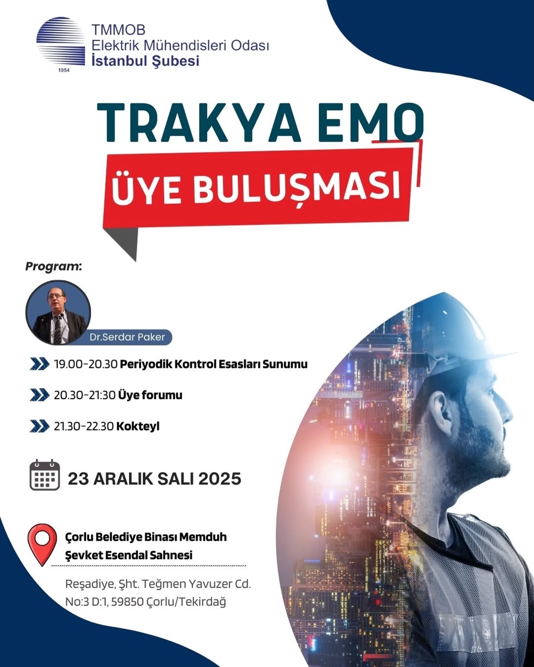 EMO İstanbul Şubesi olarak 23 Aralık 2025 Salı günü saat 19:00‘da Çorlu Belediye Binası Memduh Şevket Esendal Sahnesinde Trakya EMO Üye Buluşması düzenlenecektir.