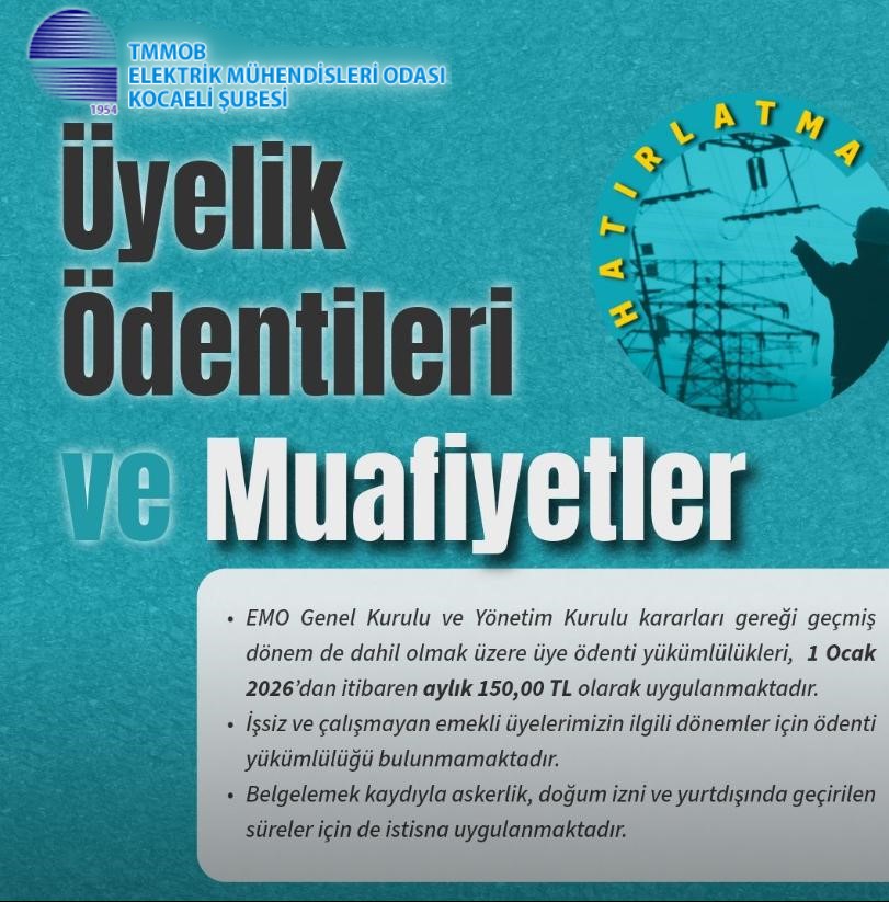 26-27 Nisan 2024 tarihlerinde gerçekleştirilen Elektrik Mühendisleri Odası (EMO) 49. Olağan Genel Kurulu`nda alınan kararla 2026 yılı için üyelik ödenti bedeli aylık 150 TL olarak belirlenmiştir.  Geçmişe dönük üyelik ödentileri, ödemenin yapıldığı dönemdeki miktar baz alınarak güncellenerek, hesaplanmaktadır. 1 Ocak 2025‘ten itibaren aylık 100.00 TL olarak uygulanan üyelik ödentisi miktarı, 1 Ocak 2026‘den itibaren 150.00 TL olarak güncellenecektir. 1 Ocak 2026 itibarıyla geçmiş yıllara ilişkin bedeller de aylık 150.00 TL üzerinden hesaplanacaktır. Artıştan etkilenmemek için üyelik ödentisi borcunuzu 2025 yıllı sonuna kadar ödeyebilirsiniz.