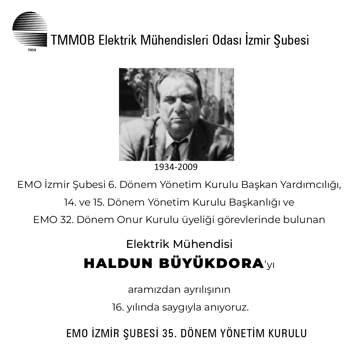 EMO İzmir Şubesi 6. Dönem Yönetim Kurulu Başkan Yardımcılığı, 14. ve 15. Dönem Yönetim Kurulu Başkanlığı ve EMO 32. Dönem Onur Kurulu üyeliği görevlerinde bulunan Elektrik Mühendisi HALDUN BÜYÜKDORA’yı