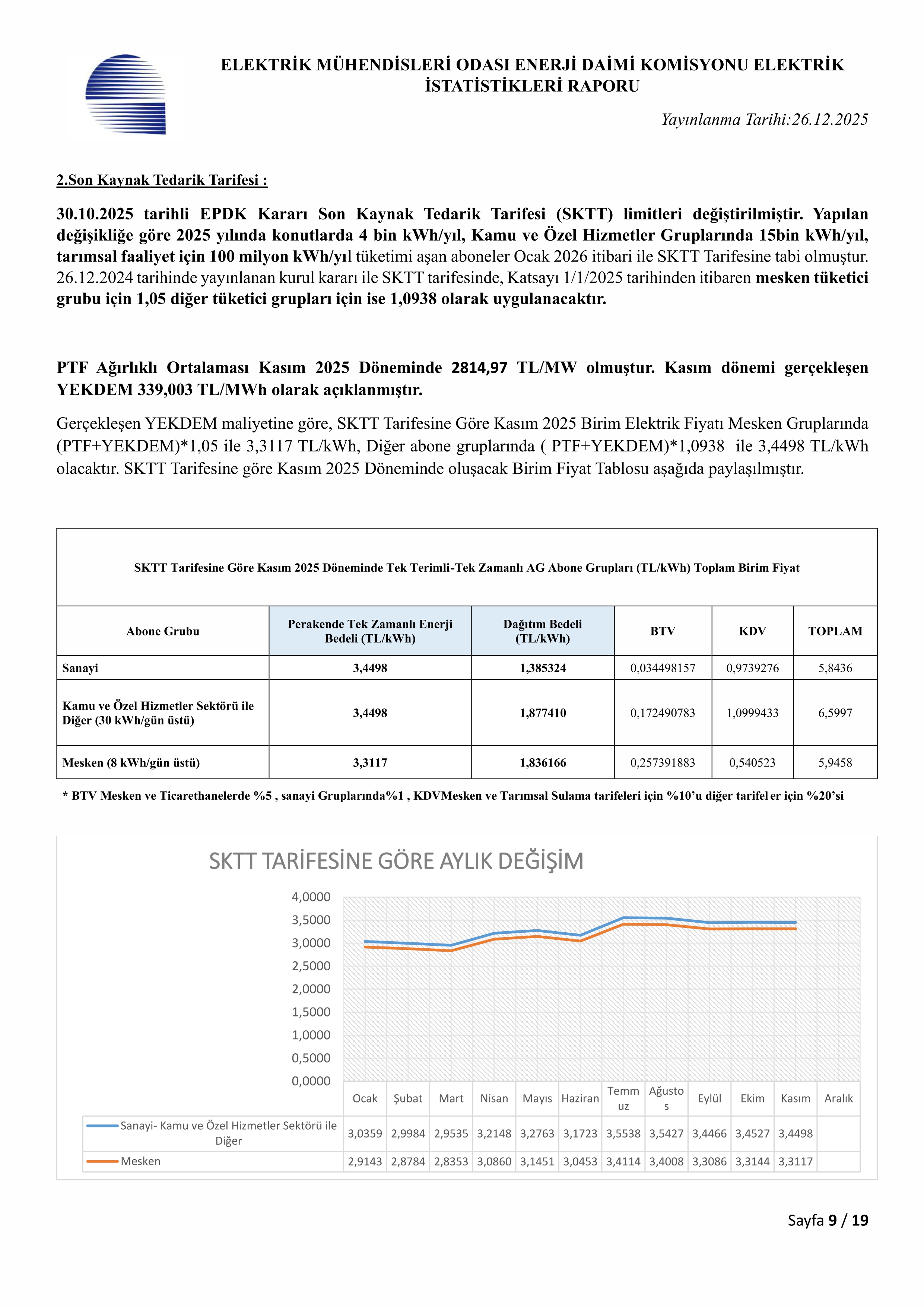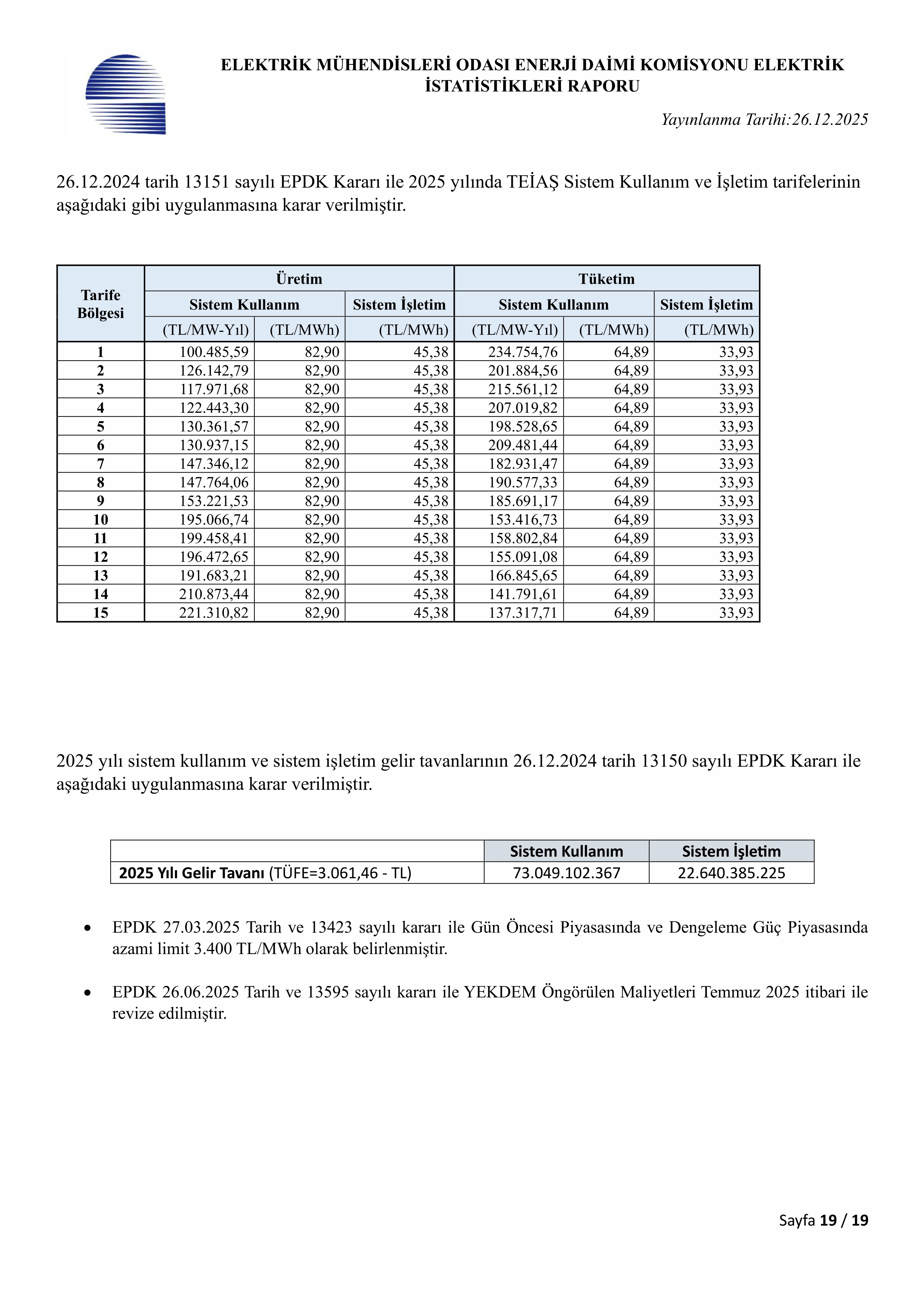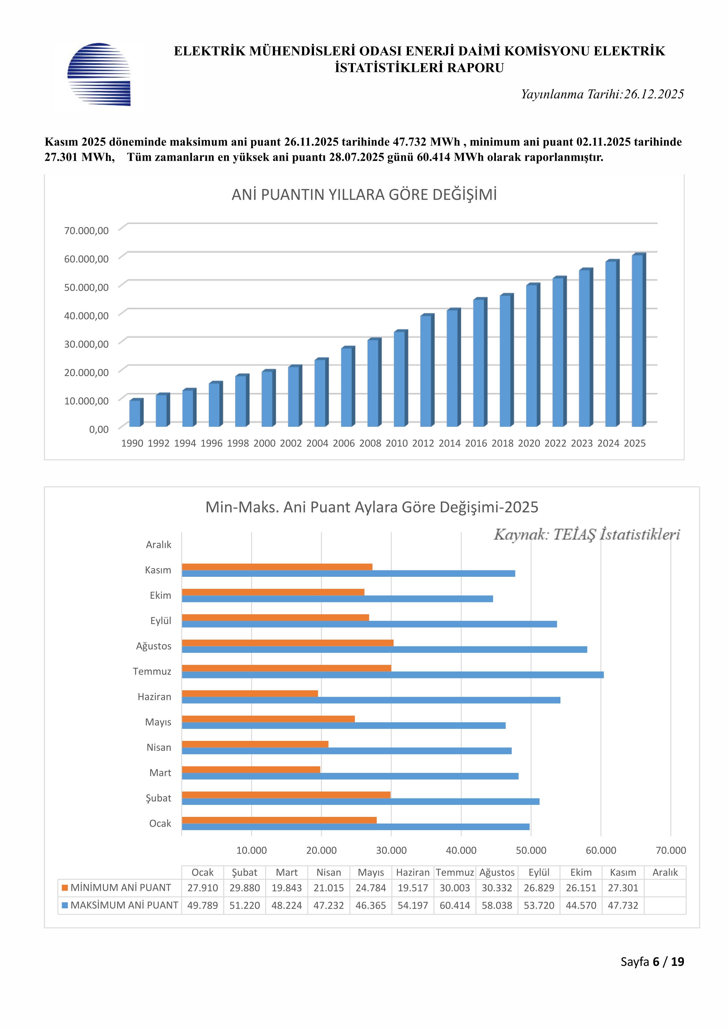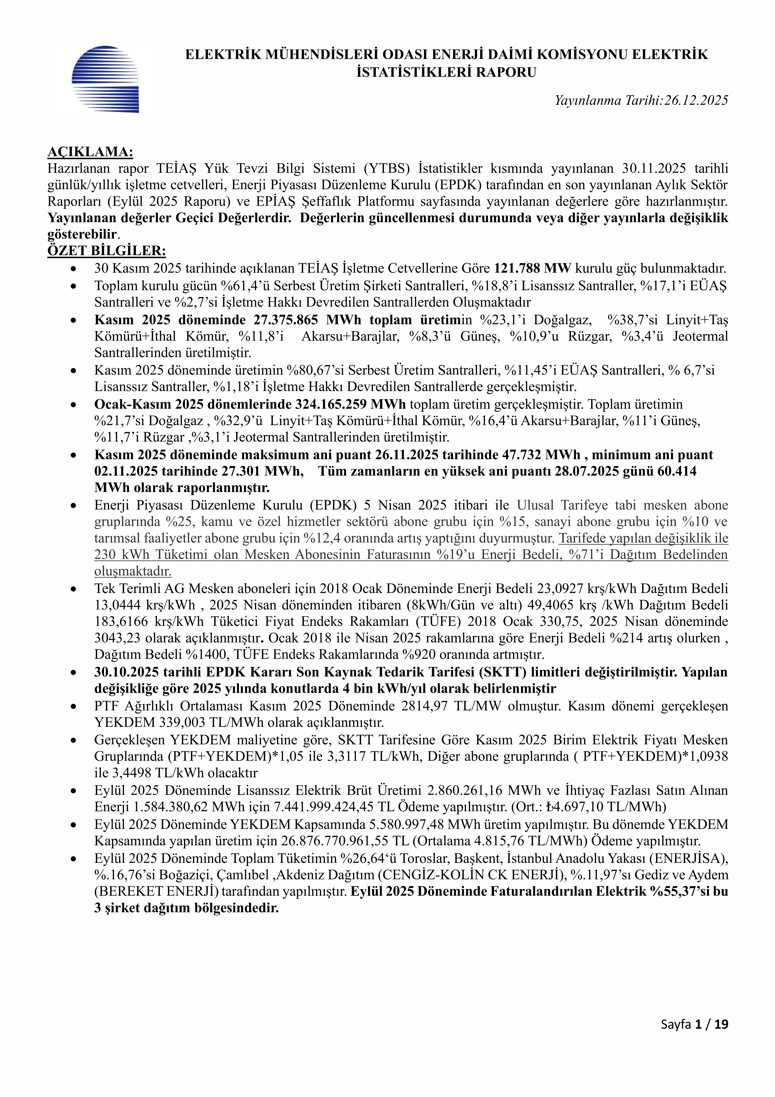 ELEKTRİK MÜHENDİSLERİ ODASI ENERJİ DAİMİ KOMİSYONU ELEKTRİK İSTATİSTİKLERİ RAPORU Yayınlanma Tarihi:26.12.2025 AÇIKLAMA: Hazırlanan rapor TEİAŞ Yük Tevzi Bilgi Sistemi (YTBS) İstatistikler kısmında yayınlanan 30.11.2025 tarihli günlük/yıllık işletme cetvelleri, Enerji Piyasası Düzenleme Kurulu (EPDK) tarafından en son yayınlanan Aylık Sektör Raporları (Eylül 2025 Raporu) ve EPİAŞ Şeffaflık Platformu sayfasında yayınlanan değerlere göre hazırlanmıştır. Yayınlanan değerler Geçici Değerlerdir. Değerlerin güncellenmesi durumunda veya diğer yayınlarla değişiklik gösterebilir.