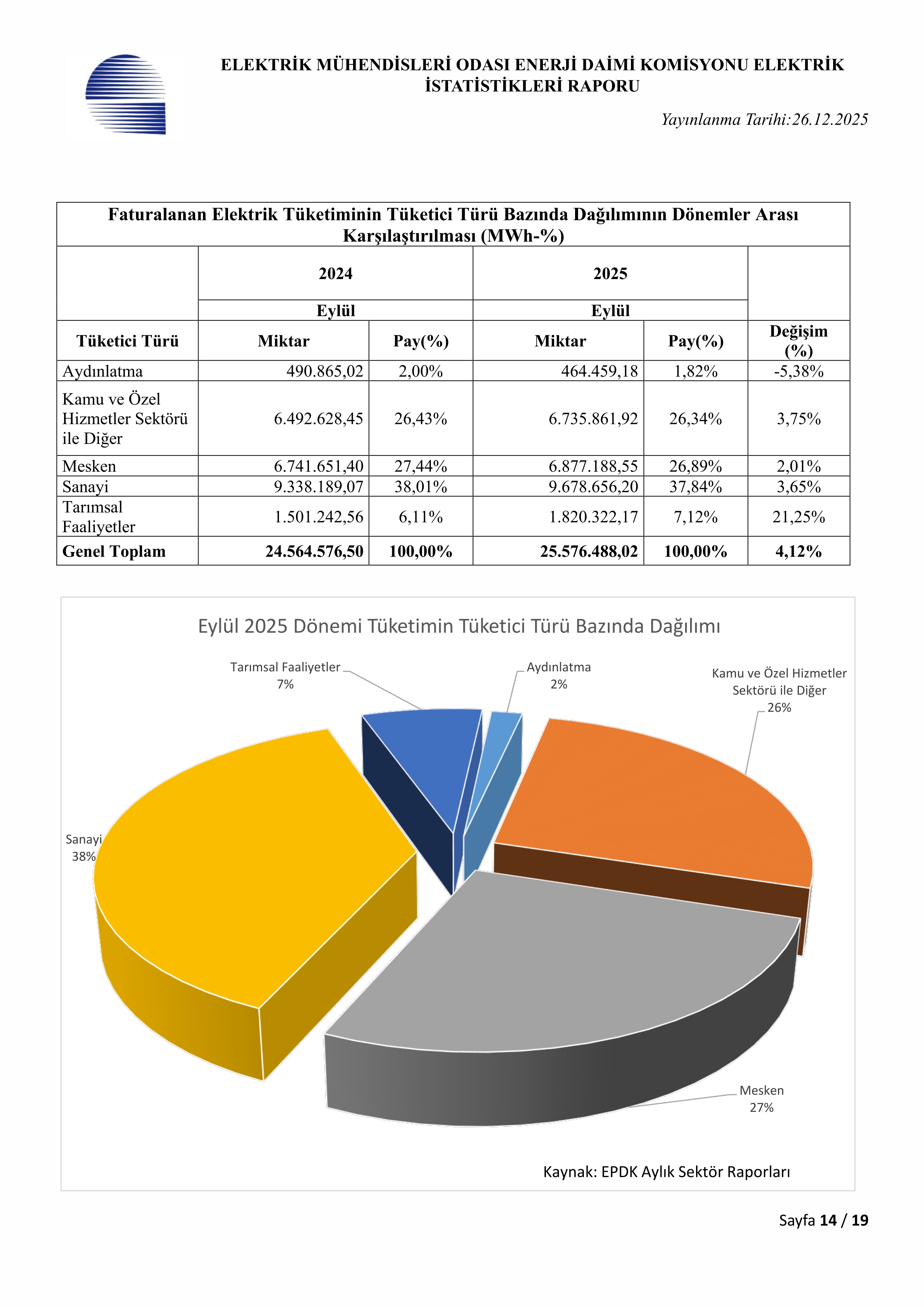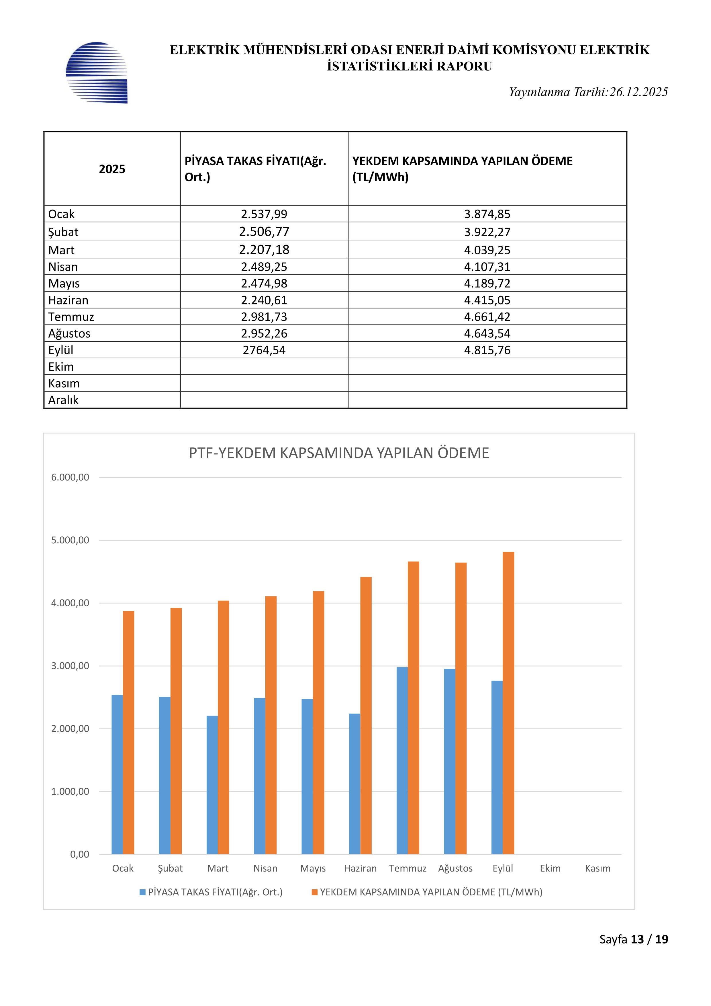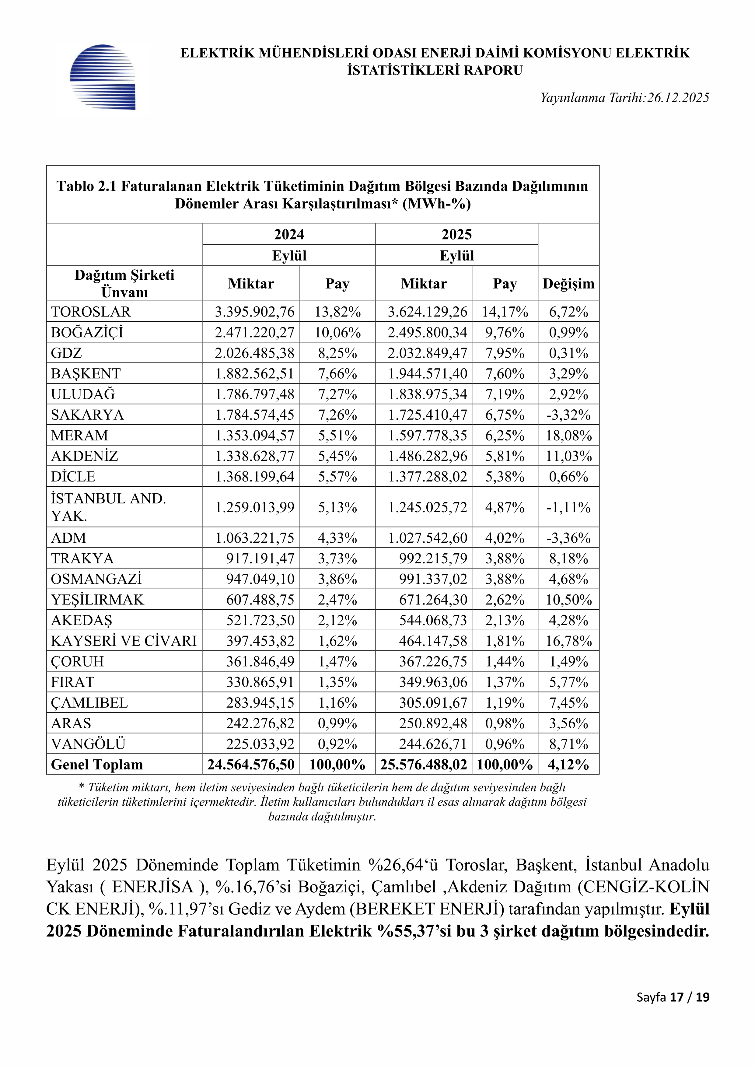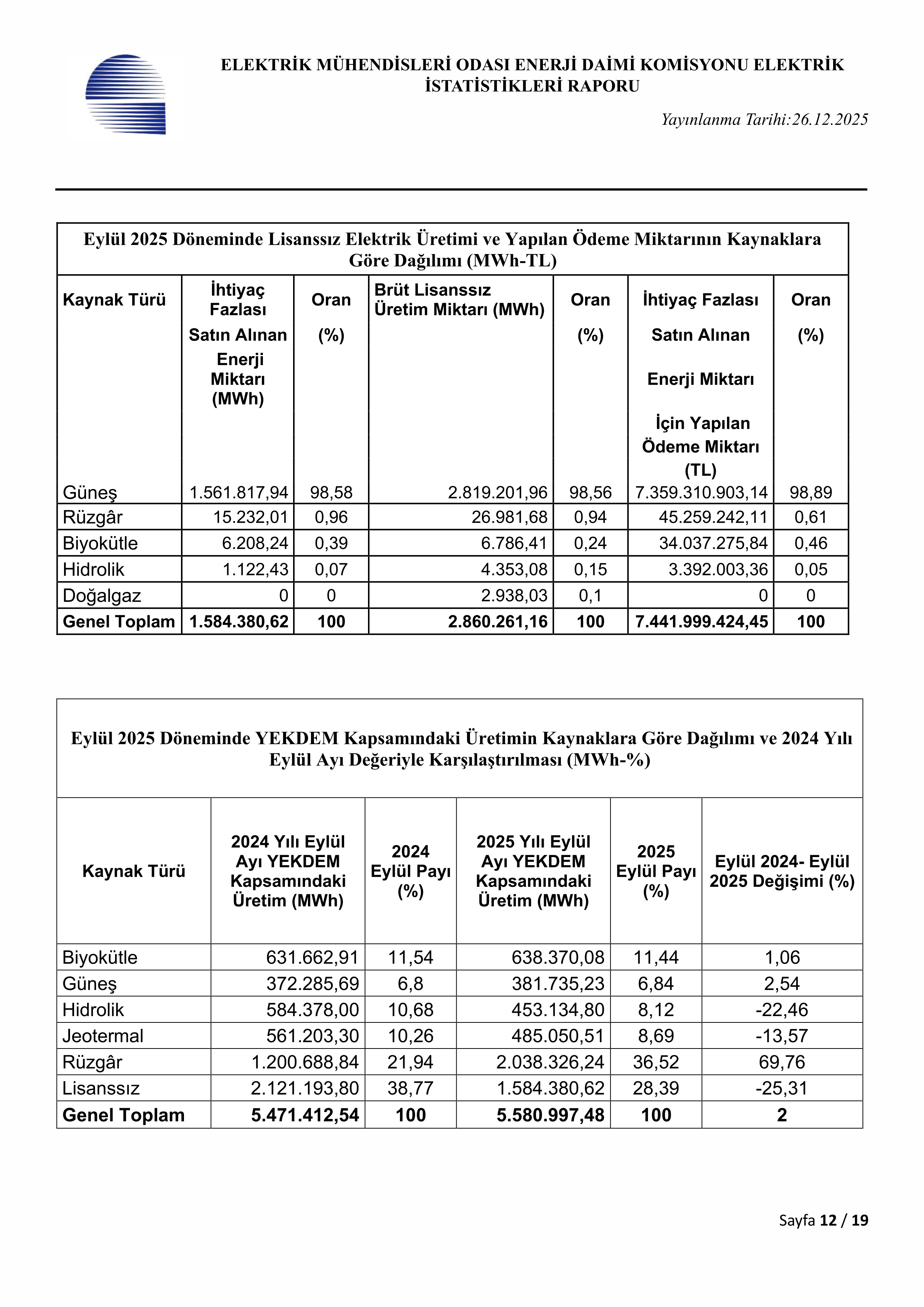 ELEKTRİK MÜHENDİSLERİ ODASI ENERJİ DAİMİ KOMİSYONU ELEKTRİK İSTATİSTİKLERİ RAPORU Yayınlanma Tarihi:26.12.2025 AÇIKLAMA: Hazırlanan rapor TEİAŞ Yük Tevzi Bilgi Sistemi (YTBS) İstatistikler kısmında yayınlanan 30.11.2025 tarihli günlük/yıllık işletme cetvelleri, Enerji Piyasası Düzenleme Kurulu (EPDK) tarafından en son yayınlanan Aylık Sektör Raporları (Eylül 2025 Raporu) ve EPİAŞ Şeffaflık Platformu sayfasında yayınlanan değerlere göre hazırlanmıştır. Yayınlanan değerler Geçici Değerlerdir. Değerlerin güncellenmesi durumunda veya diğer yayınlarla değişiklik gösterebilir.