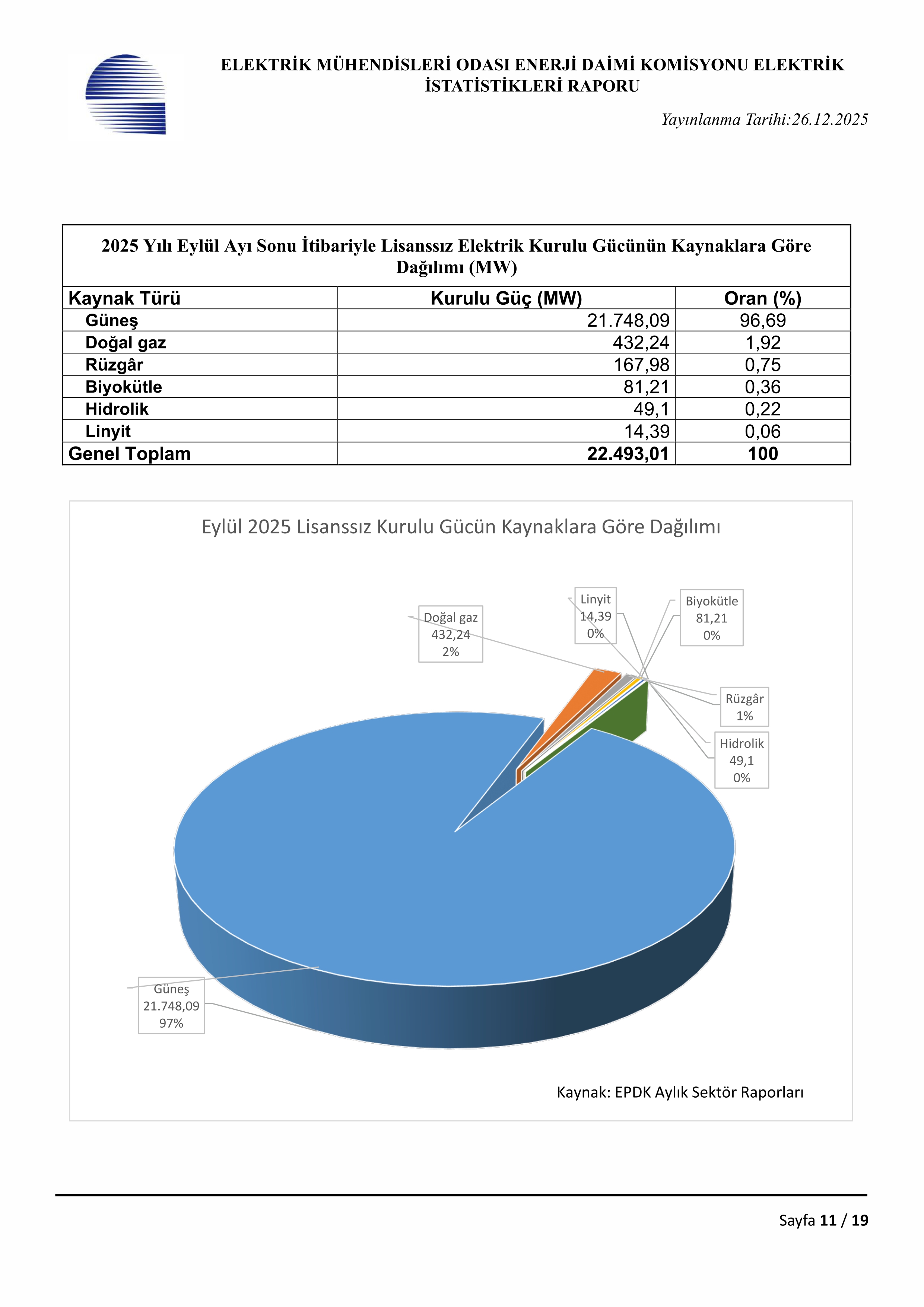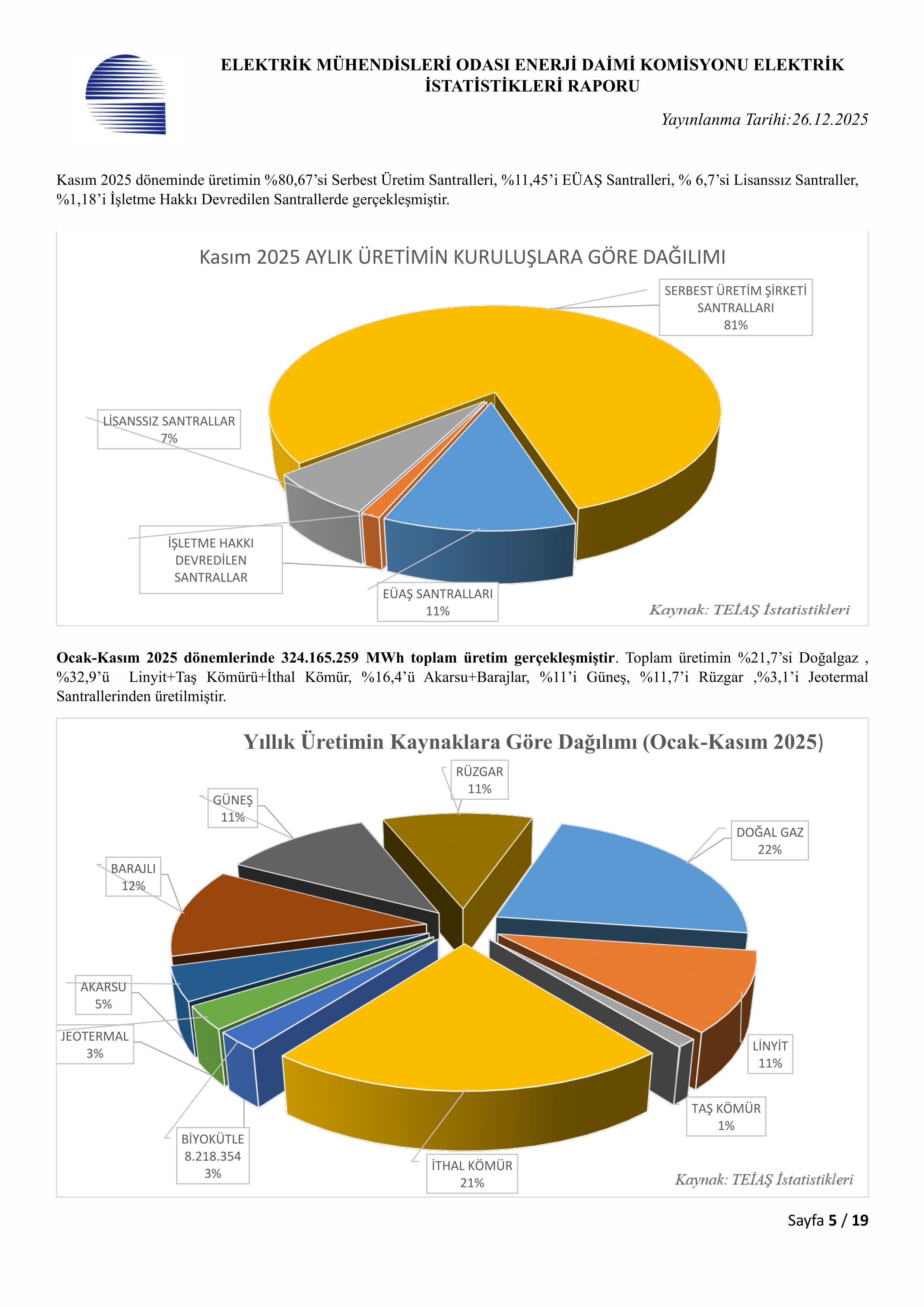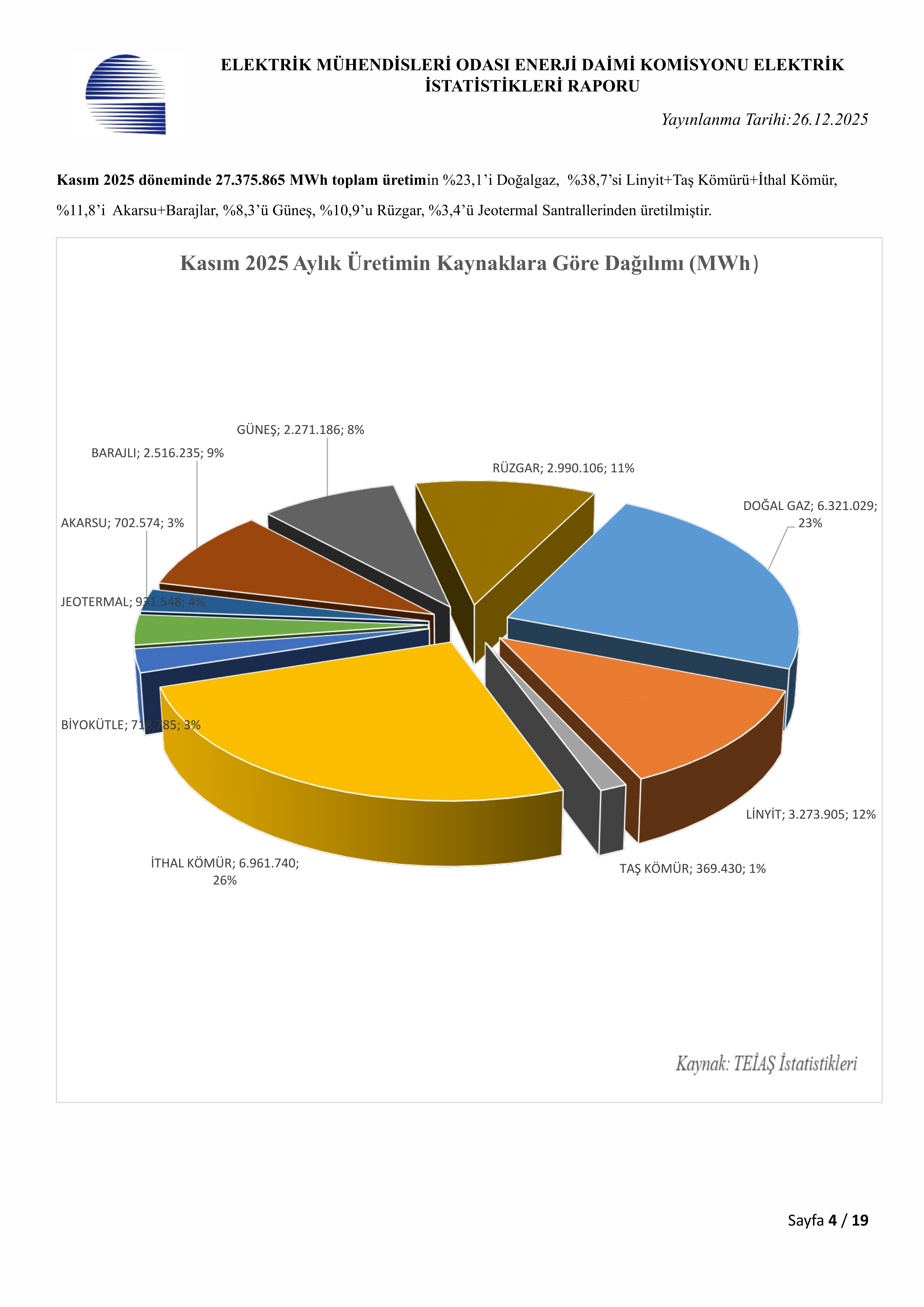 ÖZET BİLGİLER: • 30 Kasım 2025 tarihinde açıklanan TEİAŞ İşletme Cetvellerine Göre 121.788 MW kurulu güç bulunmaktadır. • Toplam kurulu gücün %61,4`ü Serbest Üretim Şirketi Santralleri, %18,8`i Lisanssız Santraller, %17,1`i EÜAŞ Santralleri ve %2,7`si İşletme Hakkı Devredilen Santrallerden Oluşmaktadır • Kasım 2025 döneminde 27.375.865 MWh toplam üretimin %23,1`i Doğalgaz, %38,7`si Linyit+Taş Kömürü+İthal Kömür, %11,8`i Akarsu+Barajlar, %8,3`ü Güneş, %10,9`u Rüzgar, %3,4`ü Jeotermal Santrallerinden üretilmiştir. • Kasım 2025 döneminde üretimin %80,67`si Serbest Üretim Santralleri, %11,45`i EÜAŞ Santralleri, % 6,7`si Lisanssız Santraller, %1,18`i İşletme Hakkı Devredilen Santrallerde gerçekleşmiştir. • Ocak-Kasım 2025 dönemlerinde 324.165.259 MWh toplam üretim gerçekleşmiştir. Toplam üretimin %21,7`si Doğalgaz , %32,9`ü Linyit+Taş Kömürü+İthal Kömür, %16,4`ü Akarsu+Barajlar, %11`i Güneş, %11,7`i Rüzgar ,%3,1`i Jeotermal Santrallerinden üretilmiştir. • Kasım 2025 döneminde maksimum ani puant 26.11.2025 tarihinde 47.732 MWh , minimum ani puant 02.11.2025 tarihinde 27.301 MWh, Tüm zamanların en yüksek ani puantı 28.07.2025 günü 60.414 MWh olarak raporlanmıştır. • Enerji Piyasası Düzenleme Kurulu (EPDK) 5 Nisan 2025 itibari ile Ulusal Tarifeye tabi mesken abone gruplarında %25, kamu ve özel hizmetler sektörü abone grubu için %15, sanayi abone grubu için %10 ve tarımsal faaliyetler abone grubu için %12,4 oranında artış yaptığını duyurmuştur. Tarifede yapılan değişiklik ile 230 kWh Tüketimi olan Mesken Abonesinin Faturasının %19`u Enerji Bedeli, %71`i Dağıtım Bedelinden oluşmaktadır. • Tek Terimli AG Mesken aboneleri için 2018 Ocak Döneminde Enerji Bedeli 23,0927 krş/kWh Dağıtım Bedeli 13,0444 krş/kWh , 2025 Nisan döneminden itibaren (8kWh/Gün ve altı) 49,4065 krş /kWh Dağıtım Bedeli 183,6166 krş/kWh Tüketici Fiyat Endeks Rakamları (TÜFE) 2018 Ocak 330,75, 2025 Nisan döneminde 3043,23 olarak açıklanmıştır. Ocak 2018 ile Nisan 2025 rakamlarına göre Enerji Bedeli %214 artış olurken , Dağıtım Bedeli %1400, TÜFE Endeks Rakamlarında %920 oranında artmıştır. • 30.10.2025 tarihli EPDK Kararı Son Kaynak Tedarik Tarifesi (SKTT) limitleri değiştirilmiştir. Yapılan değişikliğe göre 2025 yılında konutlarda 4 bin kWh/yıl olarak belirlenmiştir • PTF Ağırlıklı Ortalaması Kasım 2025 Döneminde 2814,97 TL/MW olmuştur. Kasım dönemi gerçekleşen YEKDEM 339,003 TL/MWh olarak açıklanmıştır. • Gerçekleşen YEKDEM maliyetine göre, SKTT Tarifesine Göre Kasım 2025 Birim Elektrik Fiyatı Mesken Gruplarında (PTF+YEKDEM)*1,05 ile 3,3117 TL/kWh, Diğer abone gruplarında ( PTF+YEKDEM)*1,0938 ile 3,4498 TL/kWh olacaktır • Eylül 2025 Döneminde Lisanssız Elektrik Brüt Üretimi 2.860.261,16 MWh ve İhtiyaç Fazlası Satın Alınan Enerji 1.584.380,62 MWh için 7.441.999.424,45 TL Ödeme yapılmıştır. (Ort.: ₺4.697,10 TL/MWh) • Eylül 2025 Döneminde YEKDEM Kapsamında 5.580.997,48 MWh üretim yapılmıştır. Bu dönemde YEKDEM Kapsamında yapılan üretim için 26.876.770.961,55 TL (Ortalama 4.815,76 TL/MWh) Ödeme yapılmıştır. • Eylül 2025 Döneminde Toplam Tüketimin %26,64‘ü Toroslar, Başkent, İstanbul Anadolu Yakası (ENERJİSA), %.16,76`si Boğaziçi, Çamlıbel ,Akdeniz Dağıtım (CENGİZ-KOLİN CK ENERJİ), %.11,97`sı Gediz ve Aydem (BEREKET ENERJİ) tarafından yapılmıştır. Eylül 2025 Döneminde Faturalandırılan Elektrik %55,37`si bu 3 şirket dağıtım bölgesindedir.