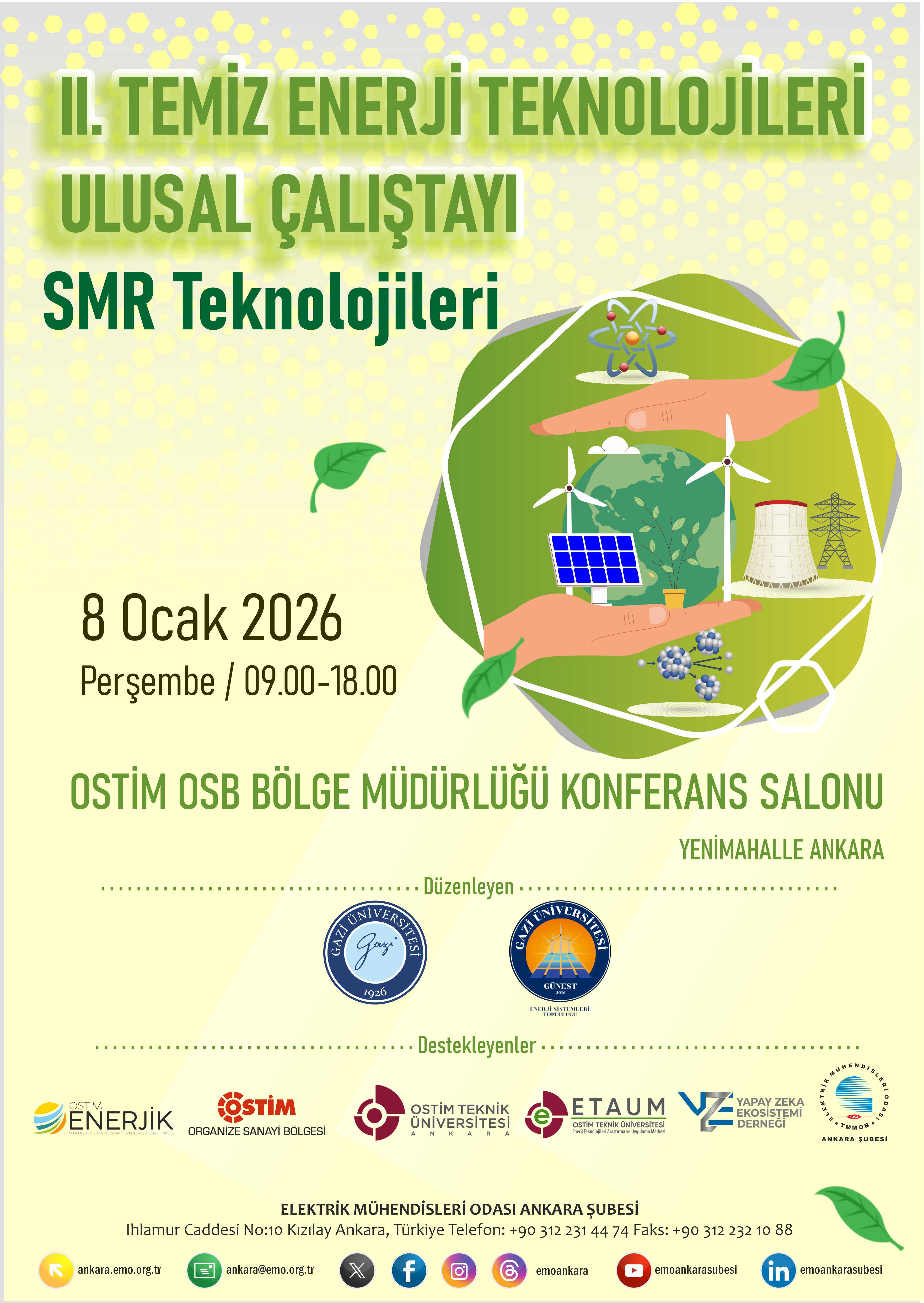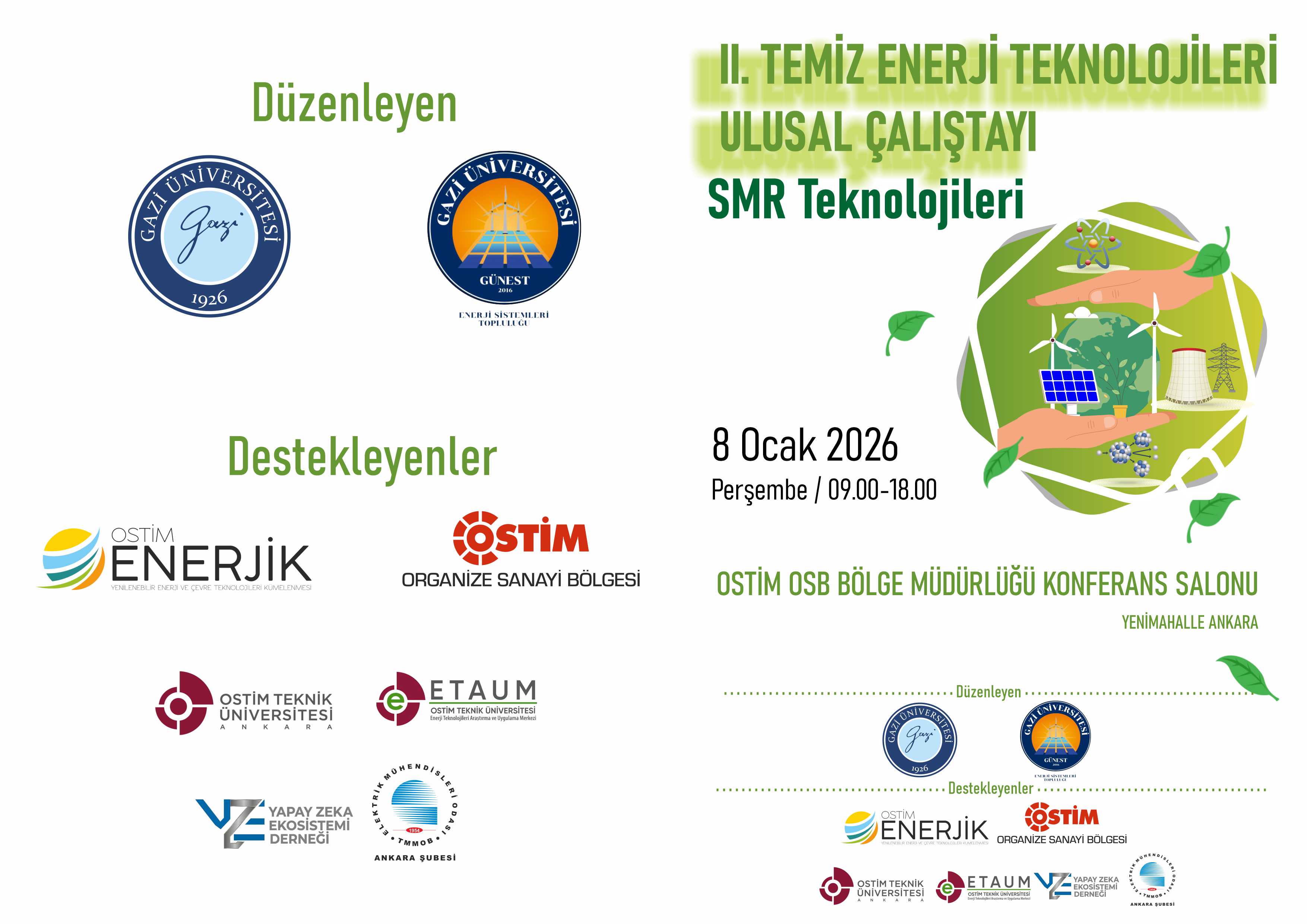 Geçtiğimiz yıl 1.’si düzenlenen Temiz Enerji Teknolojileri Ulusal Çalıştayı’nın 2.’si 8 Ocak 2026 tarihinde OSTİM OSB Yönetim Binası Konferans Salonu’nda düzenleniyor. Gazi Üniversitesi ve Gazi Üniversitesi Enerji Sistemleri Topluluğu tarafından düzenlenen etkinliğin destekleyenleri ise OSTİM ENERJİK, OSTİM Teknik Üniversitesi ETAUM, OSTİM Teknik Üniversitesi, OSTİM OSB, Yapay Zekâ Ekosistemi Derneği ve EMO Ankara Şubesi’nden oluşmakta. 8 Ocak Perşembe günü saat 09.00’da başlayacak olan etkinliğin programı haberimizin devamındadır.