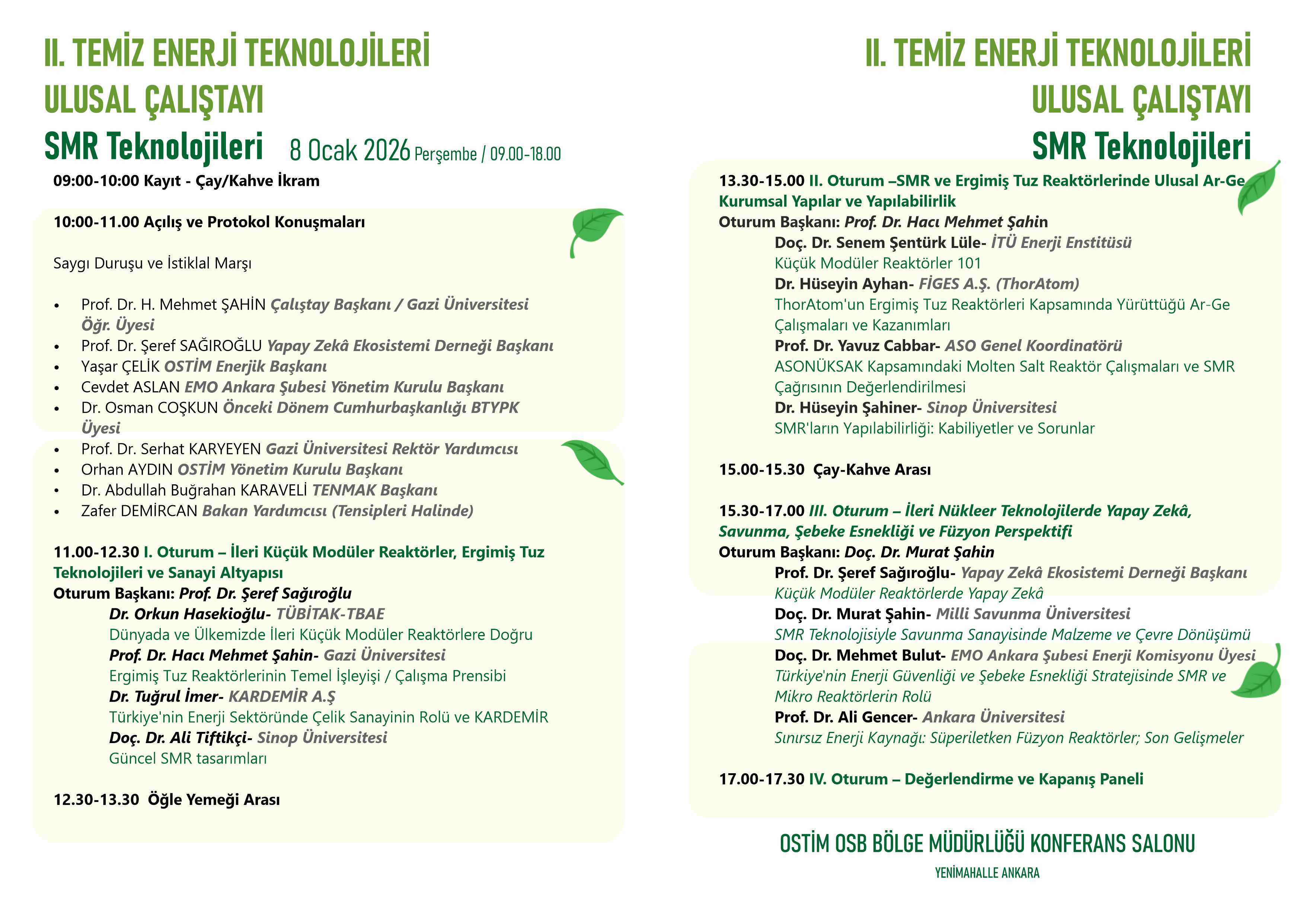 II. TEMİZ ENERJİ TEKNOLOJİLERİ ULUSAL ÇALIŞTAYI 8 Ocak 2026 (Perşembe) Saat: 09.00-18.00 OSTİM OSB Bölge Müdürlüğü Konferans Salonu (Ostim OSB, 06374 Yenimahalle/Ankara) 09:00-10:00 Kayıt - Çay/Kahve İkram 10:00-11.00 Açılış ve Protokol Konuşmaları Saygı Duruşu ve İstiklal Marşı Prof. Dr. H. Mehmet ŞAHİN Çalıştay Başkanı / Gazi Üniversitesi Öğr. Üyesi Prof. Dr. Şeref SAĞIROĞLU Yapay Zekâ Ekosistemi Derneği Başkanı Yaşar ÇELİK OSTİM Enerjik Başkanı Cevdet ASLAN EMO Ankara Şubesi Yönetim Kurulu Başkanı Dr. Osman COŞKUN Önceki Dönem Cumhurbaşkanlığı BTYPK Üyesi Prof. Dr. Serhat KARYEYEN Gazi Üniversitesi Rektör Yardımcısı Orhan AYDIN OSTİM OSB Başkanı Dr. Abdullah Buğrahan KARAVELİ TENMAK Başkanı Zafer DEMİRCAN Bakan Yardımcısı (Tensipleri Halinde) 11.00-12.30 I. Oturum – İleri Küçük Modüler Reaktörler, Ergimiş Tuz Teknolojileri ve Sanayi Altyapısı Oturum Başkanı: Prof. Dr. Şeref Sağıroğlu Dr. Orkun Hasekioğlu- TÜBİTAK-TBAE Dünyada ve Ülkemizde İleri Küçük Modüler Reaktörlere Doğru Prof. Dr. Hacı Mehmet Şahin- Gazi Üniversitesi Ergimiş Tuz Reaktörlerinin Temel İşleyişi / Çalışma Prensibi Dr. Tuğrul İmer- KARDEMİR A.Ş Türkiye‘nin Enerji Sektöründe Çelik Sanayinin Rolü ve KARDEMİR Doç. Dr. Ali Tiftikçi- Sinop Üniversitesi Güncel SMR tasarımları 12.30-13.30 Öğle Yemeği Arası 13.30-15.00 II. Oturum –SMR ve Ergimiş Tuz Reaktörlerinde Ulusal Ar-Ge, Kurumsal Yapılar ve Yapılabilirlik Oturum Başkanı: Prof. Dr. Hacı Mehmet Şahin Doç. Dr. Senem Şentürk Lüle- İTÜ Enerji Enstitüsü Küçük Modüler Reaktörler 101 Dr. Hüseyin Ayhan- FİGES A.Ş. (ThorAtom) ThorAtom‘un Ergimiş Tuz Reaktörleri Kapsamında Yürüttüğü Ar-Ge Çalışmaları ve Kazanımları Prof. Dr. Yavuz Cabbar- ASO Genel Koordinatörü ASONÜKSAK Kapsamındaki Molten Salt Reaktör Çalışmaları ve SMR Çağrısının Değerlendirilmesi Dr. Hüseyin Şahiner- Sinop Üniversitesi SMR‘ların Yapılabilirliği: Kabiliyetler ve Sorunlar 15.00-15.30 Çay-Kahve Arası 15.30-17.00 III. Oturum – İleri Nükleer Teknolojilerde Yapay Zekâ, Savunma, Şebeke Esnekliği ve Füzyon Perspektifi Oturum Başkanı: Prof. Dr. Yavuz Cabbar Prof. Dr. Şeref Sağıroğlu- Yapay Zekâ Ekosistemi Derneği Başkanı Küçük Modüler Reaktörlerde Yapay Zekâ Doç. Dr. Murat Şahin- Milli Savunma Üniversitesi SMR Teknolojisiyle Savunma Sanayisinde Malzeme ve Çevre Dönüşümü Doç. Dr. Mehmet Bulut- EMO Ankara Şubesi Enerji Komisyonu Üyesi Türkiye‘nin Enerji Güvenliği ve Şebeke Esnekliği Stratejisinde SMR ve Mikro Reaktörlerin Rolü Prof. Dr. Ali Gencer- Ankara Üniversitesi Sınırsız Enerji Kaynağı: Süperiletken Füzyon Reaktörler; Son Gelişmeler 17.00-17.30 IV. Oturum – Değerlendirme ve Kapanış Paneli
