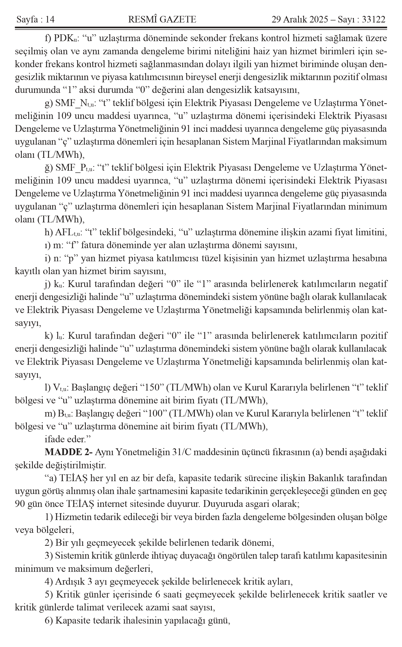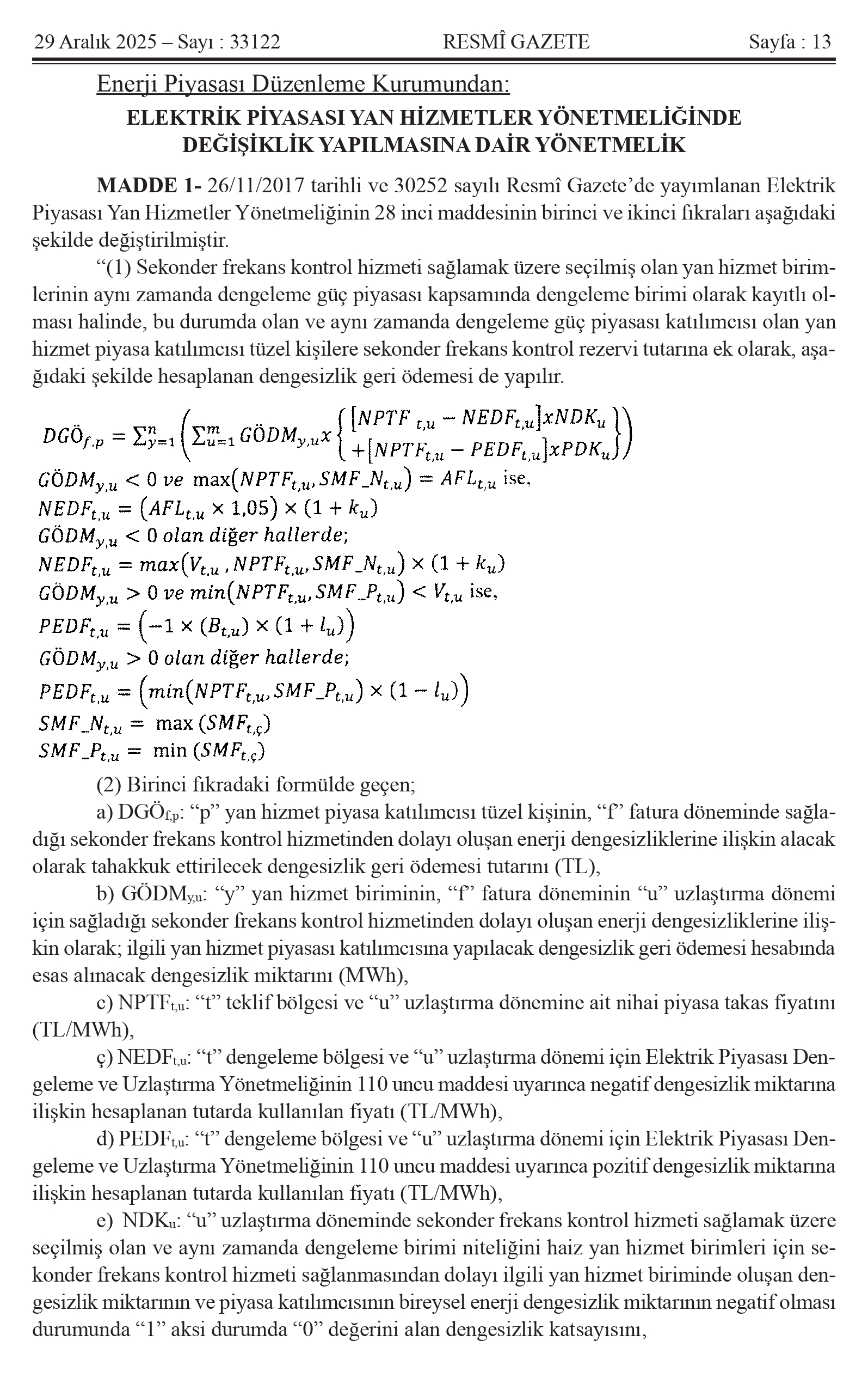Kıymetli Üyelerimiz, Mevzuat Takip Sistemimiz bilgilendirmesine göre `ELEKTRİK PİYASASI YAN HİZMETLER YÖNETMELİĞİNDE DEĞİŞİKLİK YAPILMASINA DAİR YÖNETMELİK` 29.12.2025 Tarih ve 33122 Sayılı Resmi Gazetede yayımlanmıştır.