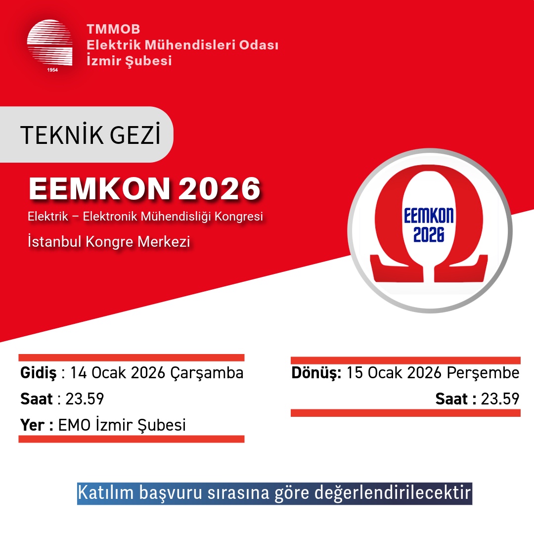 14–15 Ocak 2026 tarihlerinde İstanbul Kongre Merkezi`nde gerçekleştirilecek olan EEMKON 2026; akademi, sanayi ve kamu sektörünü bir araya getiren, elektrik, elektronik, haberleşme ve biyomedikal mühendisliği alanlarında ülkemizin en kapsamlı etkinliklerinde biridir. Kongrede; endüstride dijital dönüşüm, yapay zekâ uygulamaları, yenilenebilir enerji ve enerji depolama, akıllı elektrik şebekeleri, akıllı şehirler ve binalar, biyomedikal teknolojiler ve siber güvenlik başlıklarında güncel gelişmeler ele alınacaktır. Beş paralel oturum yapısıyla iki gün boyunca zengin bir teknik ve akademik içerik sunulacaktır. EMO İzmir Şubesi tarafından düzenlenen bu teknik gezi ile üyelerimizin ve katılımcıların, EEMKON 2026`ya katılarak mesleki bilgi ve deneyimlerini artırmaları ve doğrudan temas kurmaları hedeflenmektedir.