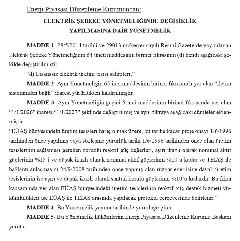 Kıymetli Üyelerimiz, Mevzuat Takip Sistemimiz bilgilendirmesine göre `ELEKTRİK ŞEBEKE YÖNETMELİĞİNDE DEĞİŞİKLİK YAPILMASINA DAİR YÖNETMELİK` 29.12.2025 Tarih ve 33122 Sayılı Resmi Gazetede yayımlanmıştır.