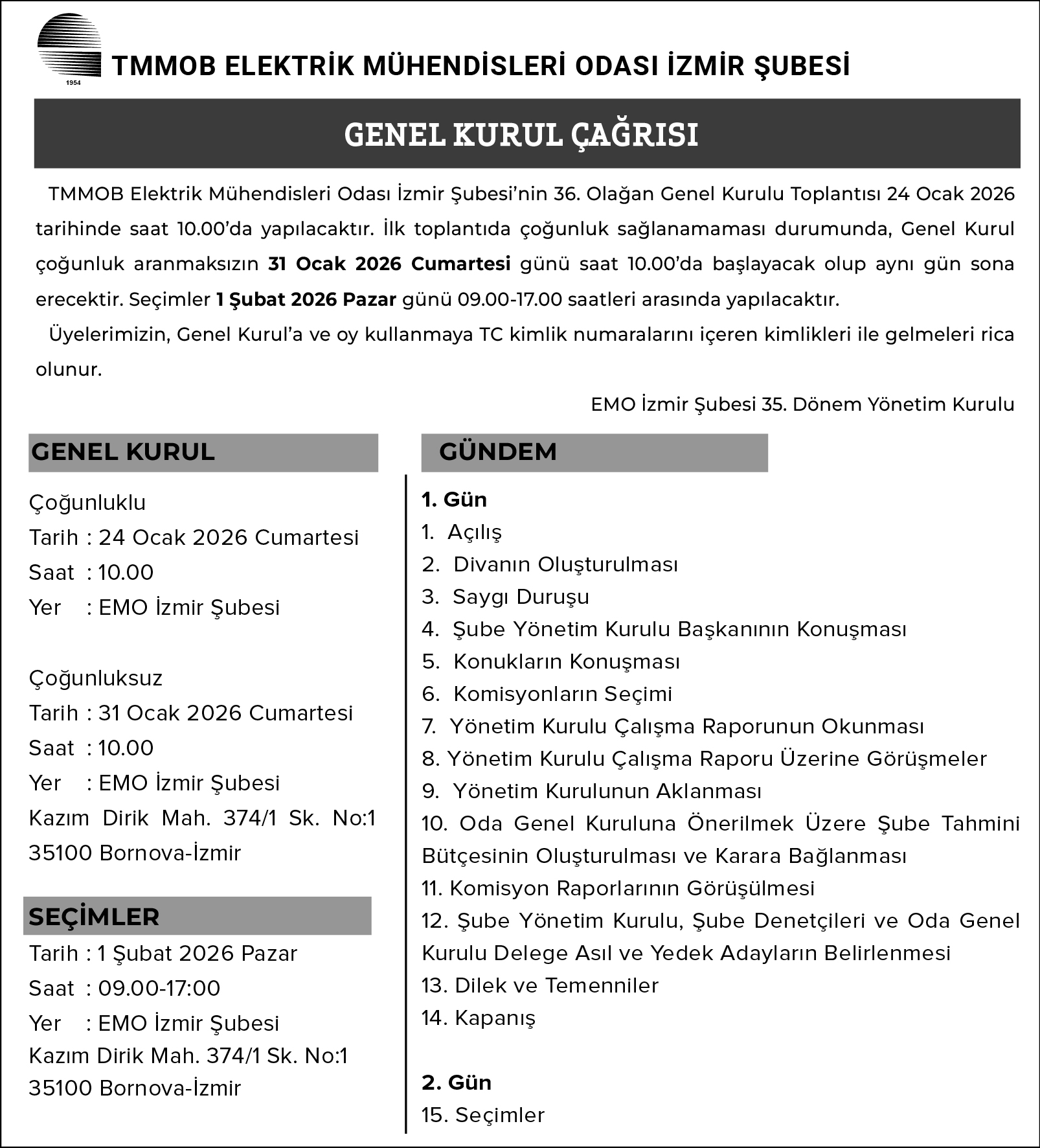 TMMOB Elektrik Mühendisleri Odası İzmir Şubesi`nin 36. Olağan Genel Kurulu Toplantısı 24 Ocak 2026 tarihinde saat 10.00`da yapılacaktır. İlk toplantıda çoğunluk sağlanamaması durumunda, Genel Kurul çoğunluk aranmaksızın 31 Ocak 2026 Cumartesi günü saat 10.00`da başlayacak olup aynı gün sona erecektir. Seçimler 1 Şubat 2026 Pazar günü 09.00-17.00 saatleri arasında yapılacaktır. Üyelerimizin, Genel Kurul‘a ve oy kullanmaya TC kimlik numaralarını içeren kimlikleri ile gelmeleri rica olunur. EMO İzmir Şubesi 35. Dönem Yönetim Kurulu