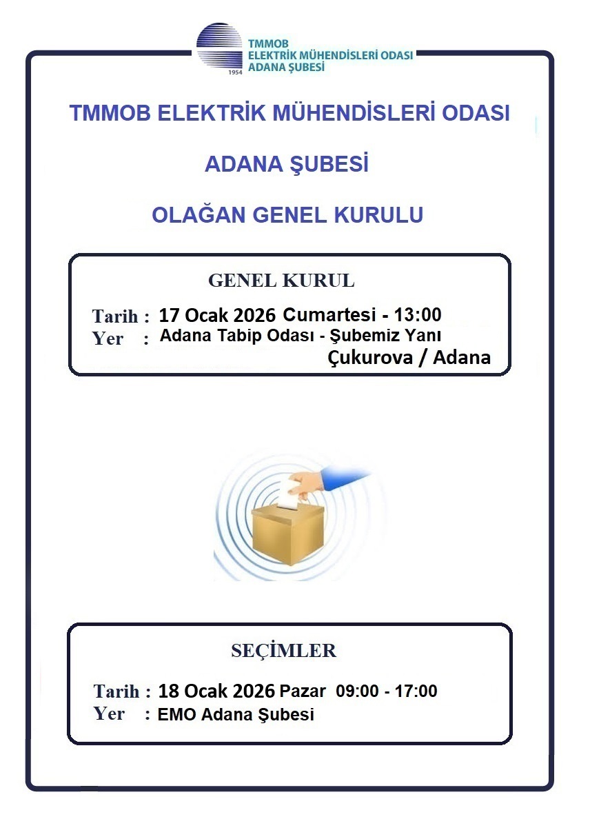 TMMOB ELEKTRİK MÜHENDİSLERİ ODASI ADANA ŞUBESİ 21. OLAĞAN GENEL KURUL DUYURUSU TMMOB EMO Adana Şubesi 21. Olağan Genel Kurulu aşağıdaki gündemle 17-18 Ocak 2026 tarihlerinde aşağıda belirtilen yer ve saatlerde gerçekleştirilecektir. Gündem: 1. Gün 1.Açılış 2.Divanın Oluşturulması 3.Saygı Duruşu ve İstiklal Marşı 4.Şube Yönetim Kurulu Başkanının Konuşması 5.Konukların Konuşmaları 6.Yönetim Kurulu Çalışma Raporunun Okunması 7.Yönetim Kurulu Çalışma Raporu Üzerine Görüşmeler 8.Yönetim Kurulunun Aklanması 9.Oda Genel Kuruluna Önerilmek Üzere Şube Tahmini Bütçesinin Oluşturulması ve Karara Bağlanması 10.Şube Yönetim Kurulu, Şube Denetçileri ve Oda Genel Kurulu Delege Asil ve Yedek Adaylarının Belirlenmesi 11.Dilek ve Temenniler 12.Kapanış 2. Gün 13. Seçimler Çoğunluksuz Genel Kurul ve Seçimler: Genel Kurul - 17 Ocak 2026 Cumartesi Saat : 13:00 Yer : Adana Tabip Odası Seçimler - 18 Ocak 2026 Pazar Saat : 09.00 - 17.00 Yer : EMO Adana Şubesi Tüm üyelerimize duyurulur.
