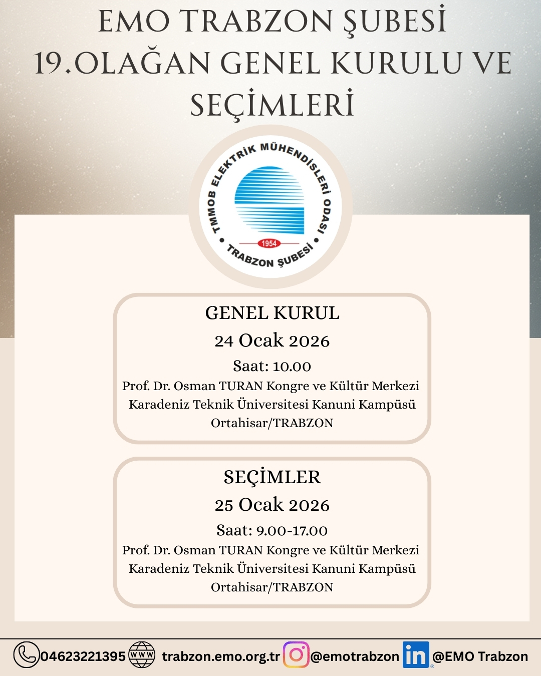 COPYRIGHT © 2005-2026 TMMOB ELEKTRİK MÜHENDİSLERİ ODASI GENEL MERKEZİIHLAMUR SOKAK NO:10 KIZILAY/ANKARATEL: +90 (312) 425 32 72 (PBX) - FAKS: +90 (312) 417 38 18 KEP ADRESİ : emo.merkez@hs01.kep.tr