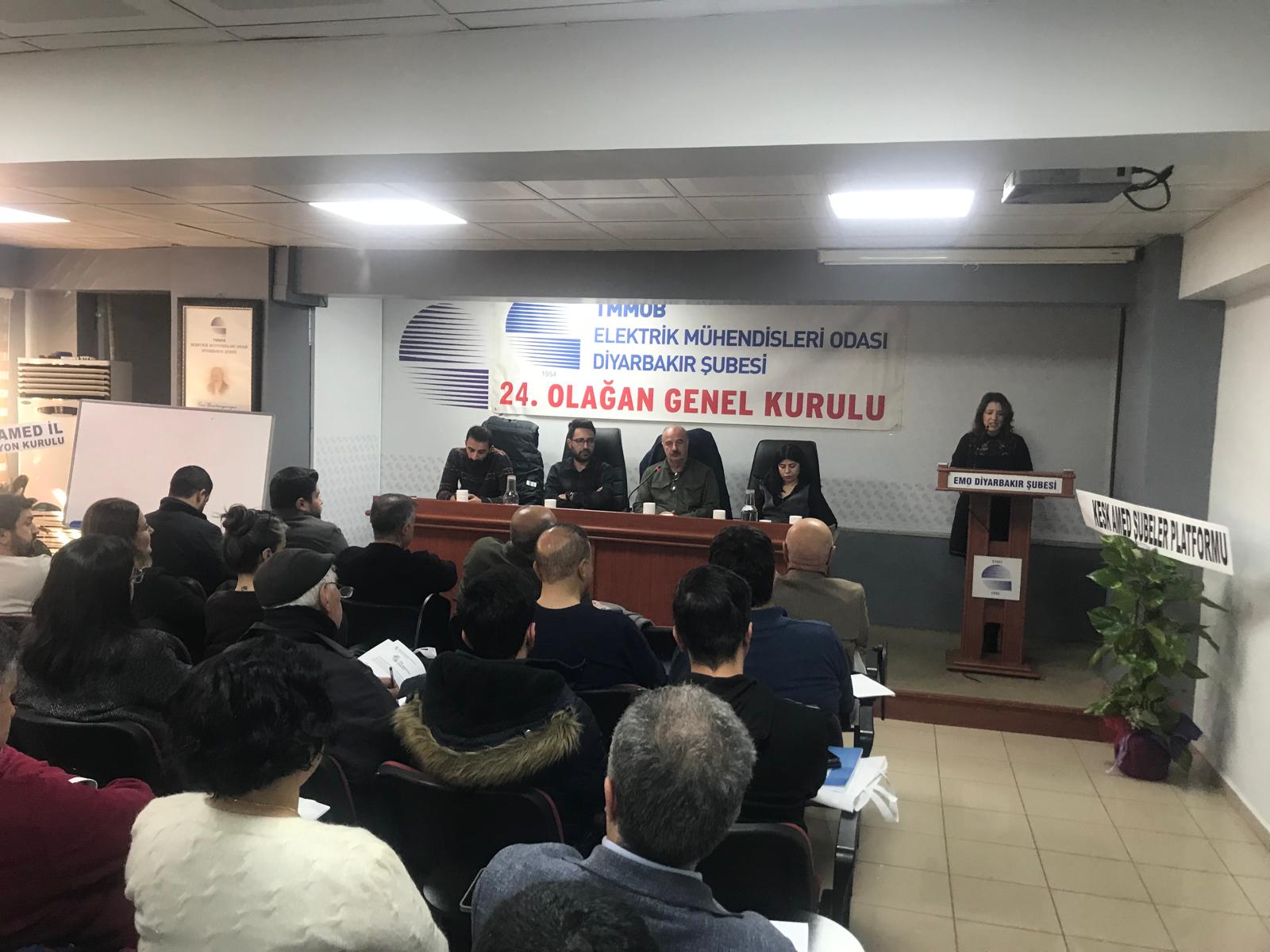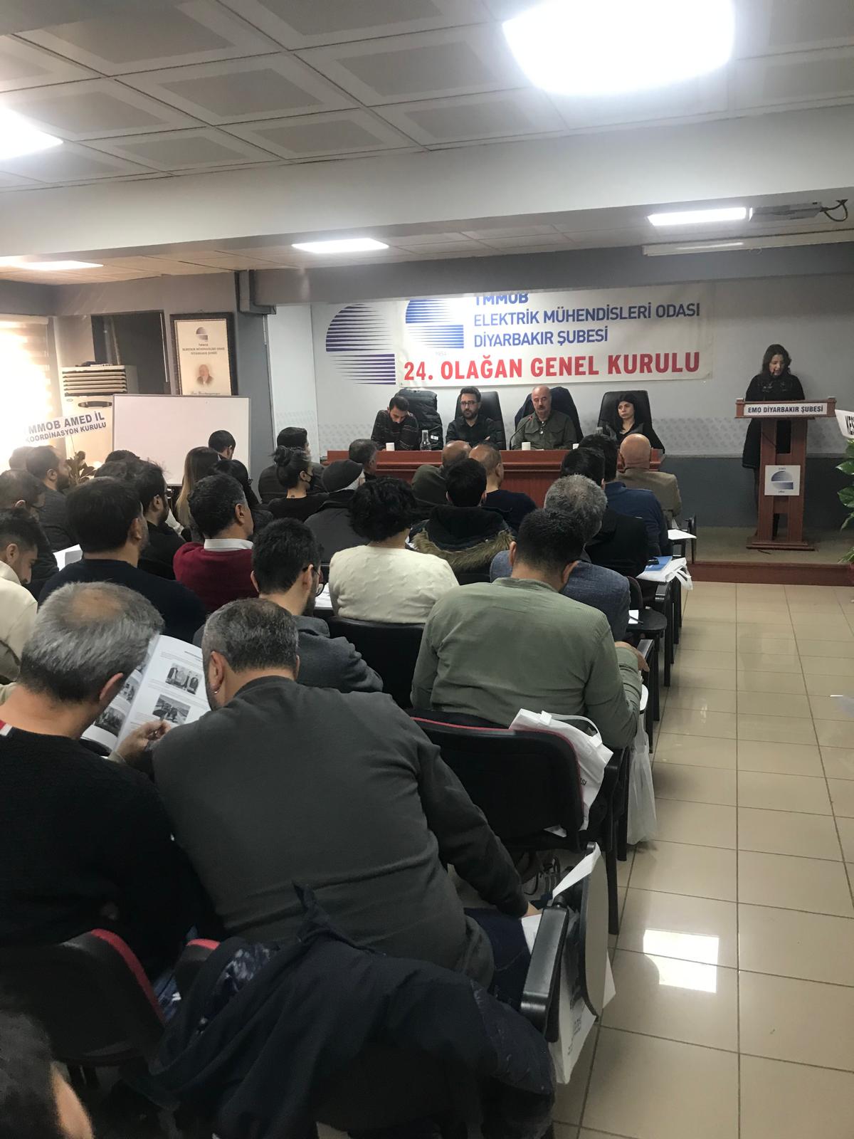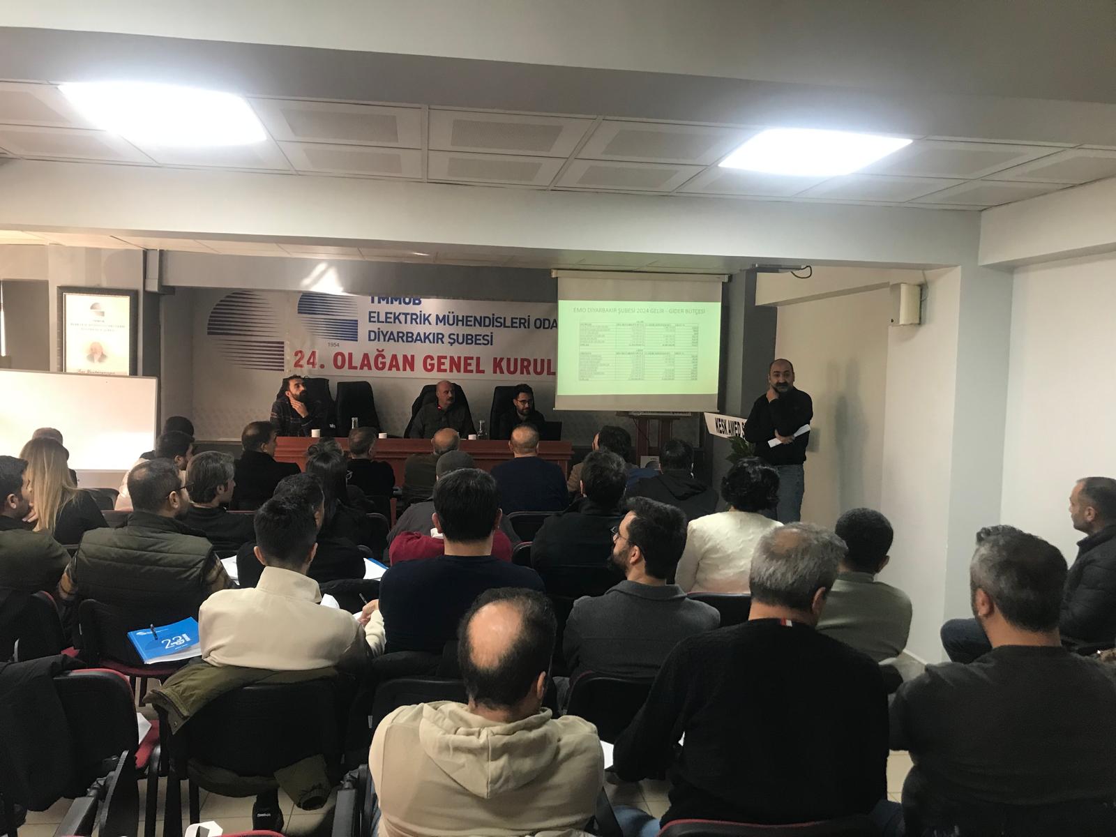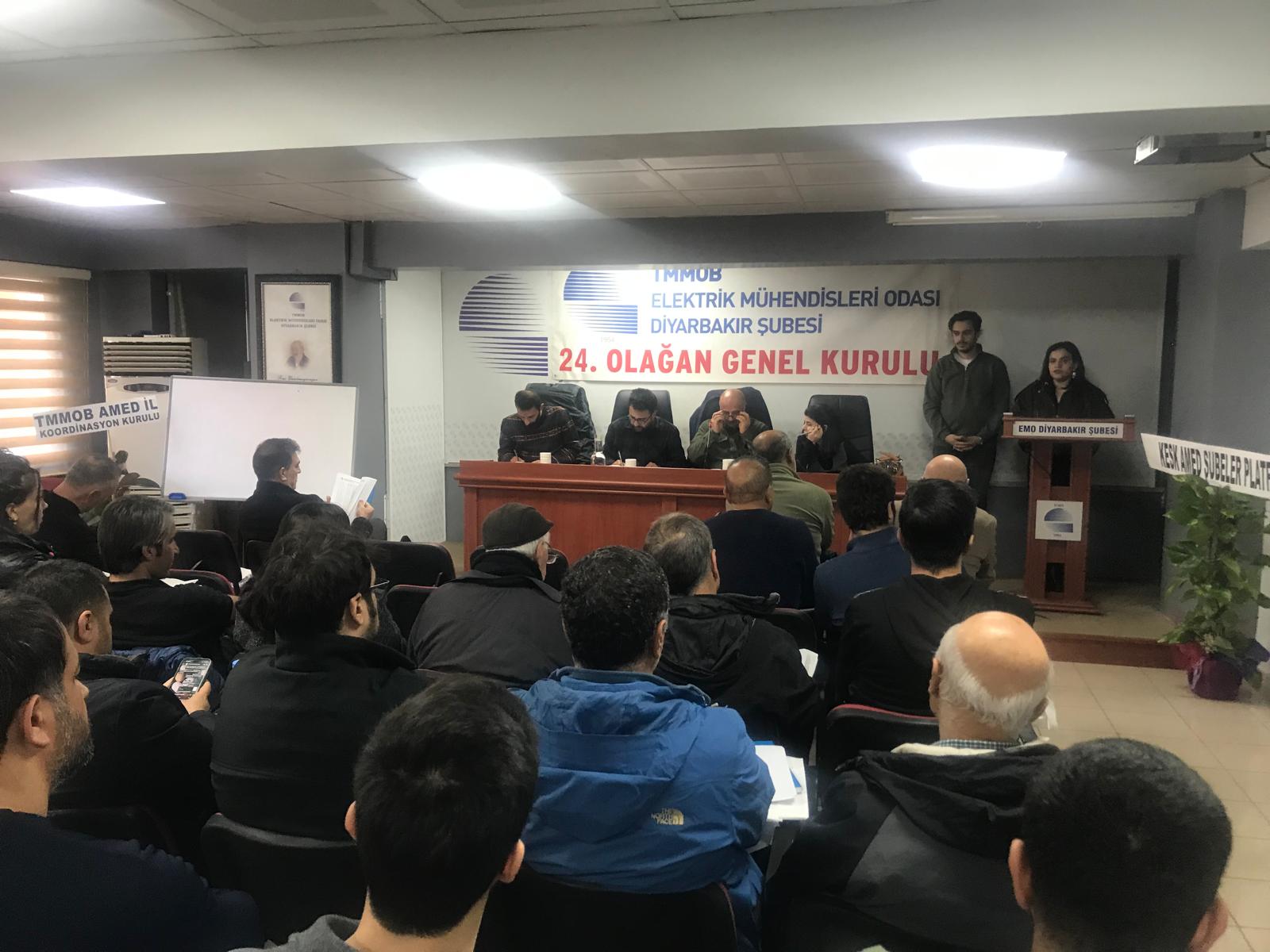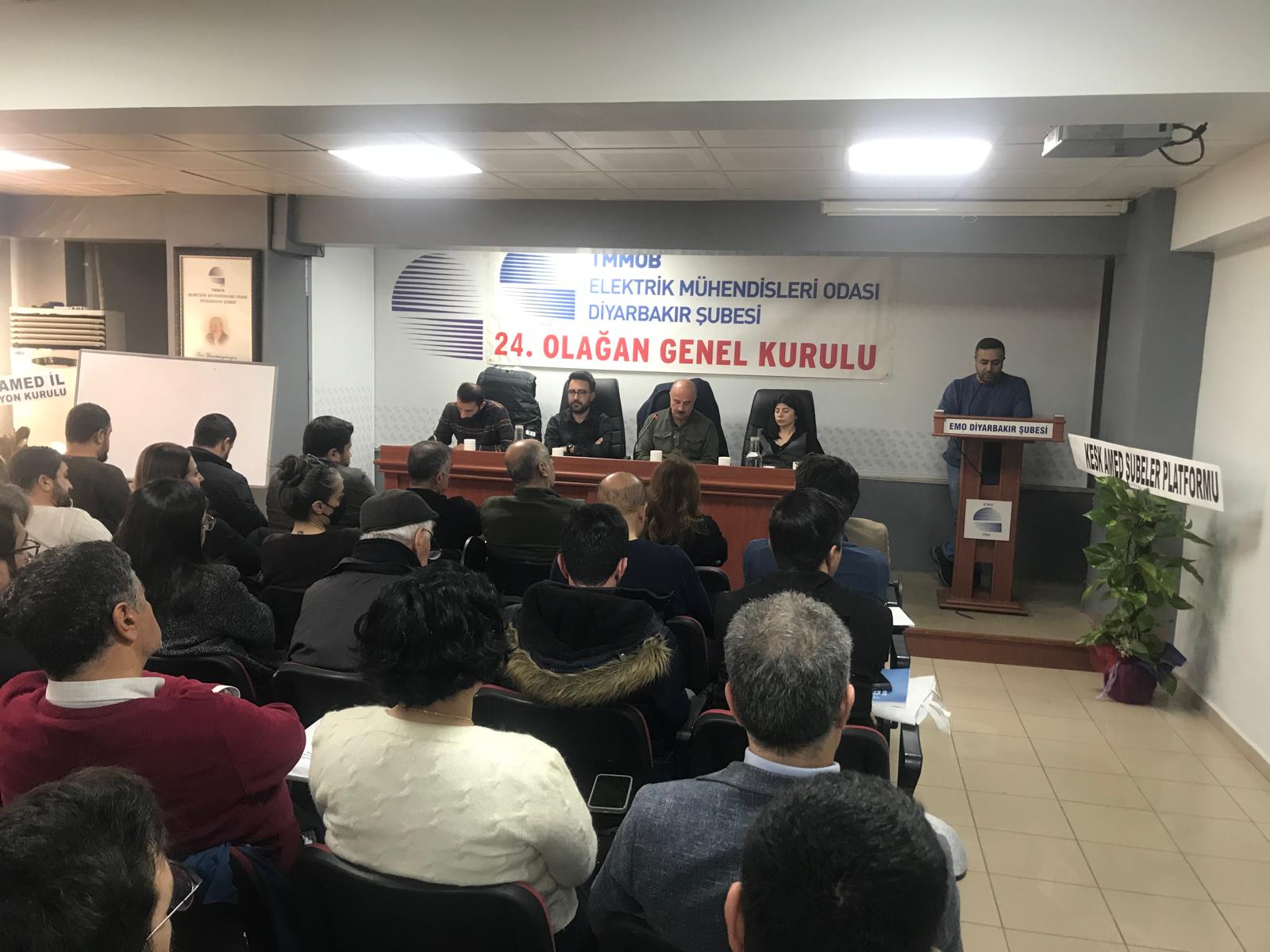 10 Ocak 2026 tarihinde gerçekleştirilen Olağan Genel Kurulda; Şube Yönetim Kurulu, Şube Denetçileri ve EMO Genel Kurul Delegelerine aday olan üyeler belirlendi.11 Ocak 2026 tarihinde ise yetkili organların (Şube Yönetim Kurulu, Şube Denetçileri ve EMO Genel Kurul Delegeleri) seçimleri yapıldı.Seçimlere tek liste ile gidildi. Yetkili Organlarda yer alan adaylar aşağıda belirtilmiştir. EMO DİYARBAKIR ŞUBESİ 24. DÖNEM YÖNETİM KURULU ADAY LİSTESİ (ASİL) 1. 30660 Ahmet SORMAZ 2. 68982 Fatoş Nujen AYHAN 3. 67886 Rahmi SELKİ 4. 73037 Hüseyin SELÇUK 5. 68430 Gurbet ŞENER 6. 34307 Makber ÇETİNKAYA 7. 59539 Seyran AY KÖSE