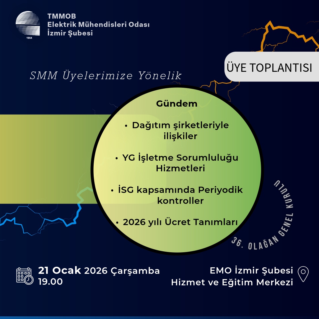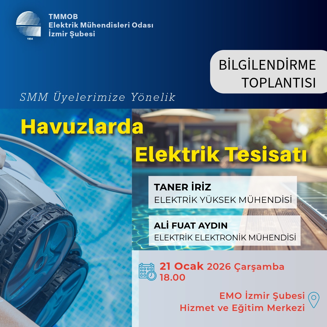 Elektrik Mühendisleri Odası (EMO) İzmir Şubesi, 21 Ocak 2026 Çarşamba günü SMM üyelere yönelik olarak `Havuzlarda Elektrik Tesisatı` başlıklı bilgilendirme toplantısı ve ardından SMM Üye Toplantısı düzenleyecektir. Elektrik Yüksek Mühendisi Taner İriz ve Elektrik Elektronik Mühendisi Ali Fuat Aydın`ın sunumlarıyla EMO İzmir Şubesi Hizmet ve Eğitim Merkezi`nde saat 18.00`de düzenlenecek bilgilendirme toplantısına ve ardından saat 19.00`da yapılacak üye toplantısına tüm SMM üyelerimiz davetlidir.