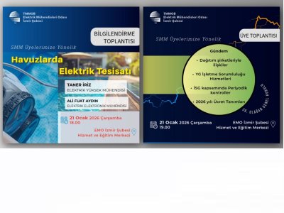 Elektrik Mühendisleri Odası (EMO) İzmir Şubesi, 21 Ocak 2026 Çarşamba günü SMM üyelere yönelik olarak `Havuzlarda Elektrik Tesisatı` başlıklı bilgilendirme toplantısı ve ardından SMM Üye Toplantısı düzenleyecektir. Elektrik Yüksek Mühendisi Taner İriz ve Elektrik Elektronik Mühendisi Ali Fuat Aydın`ın sunumlarıyla EMO İzmir Şubesi Hizmet ve Eğitim Merkezi`nde saat 18.00`de düzenlenecek bilgilendirme toplantısına ve ardından saat 19.00`da yapılacak üye toplantısına tüm SMM üyelerimiz davetlidir.