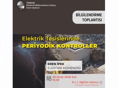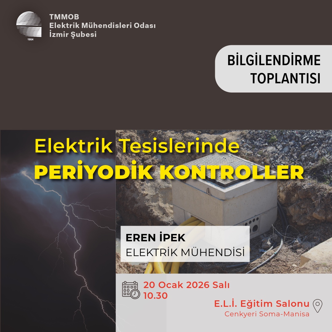 Elektrik Mühendisleri Odası (EMO) İzmir Şubesi, Ege Linyitleri İşletmeleri (E.L.İ.) Soma Eğitim Salonu`nda Elektrik Mühendisi Eren İpek`in katılımıyla 20 Ocak 2026 Salı günü saat 10.30’da “Elektrik Tesislerinde Periyodik Kontroller” başlıklı bilgilendirme toplantısı düzenleyecektir.