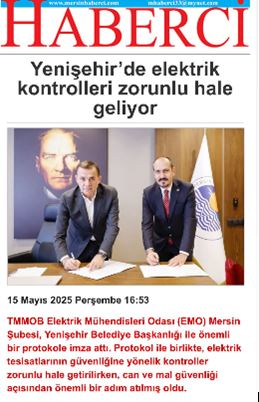 ELEKTRİK TESİSAT KONTROLLERİ YAPILMASI HUSUSUNDA İMZALANAN ÖLÇÜM PROTOKOLÜ HAKKINDA TMMOB Elektrik Mühendisleri Odası (EMO) Mersin Şubesi, 14 Mayıs 2025 tarihinde Yenişehir Belediye Başkanlığı ile önemli bir protokole imza attı. İmzalanan bu protokol kapsamında, Yenişehir ilçesinde işyeri ruhsatı almak isteyen tüm işletmelerin elektrik tesisatlarına yönelik periyodik kontroller, EMO Mersin Şubesi teknik ekibi tarafından gerçekleştirilecek. Protokol ile birlikte, elektrik tesisatlarının güvenliğine yönelik kontroller zorunlu hale getirilirken, can ve mal güvenliği açısından önemli bir adım atılmış oldu. Bu uygulama, Yenişehir Belediyesi`ne işyeri ruhsatı başvurusu yapan tüm işletmeler için geçerli olacak. EMO Mersin Şube yetkilileri, "Teknik ekibimizle ve tüm bilgi birikimimizle çalışmaya ve protokol kapsamındaki görevimizi yerine getirmeye hazırız" açıklamasında bulunarak, sürecin başlamasından duydukları memnuniyeti dile getirdi. Yenişehir Belediye Başkanı Sn. Abdullah Özyiğit`e konuya gösterdiği hassasiyet ve EMO ile kurduğu iş birliği nedeniyle teşekkür edildi. Elektrik Mühendisleri Odası Mersin Şubesi, elektrik tesislerinde can ve mal güvenliğini sağlamak amacıyla meslek alanına giren her konuda kamusal sorumluluk anlayışıyla hizmet sunmaya devam edeceklerini ve bu bilincin tüm belediyelerde yaygınlaşması için çalışmalarını sürdüreceklerini belirtti. Prof. Dr. Alkan ALKAYA Elektrik Mühendisleri Odası Mersin Şube Yönetim Kurulu Başkanı 15.05.2025