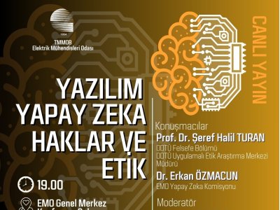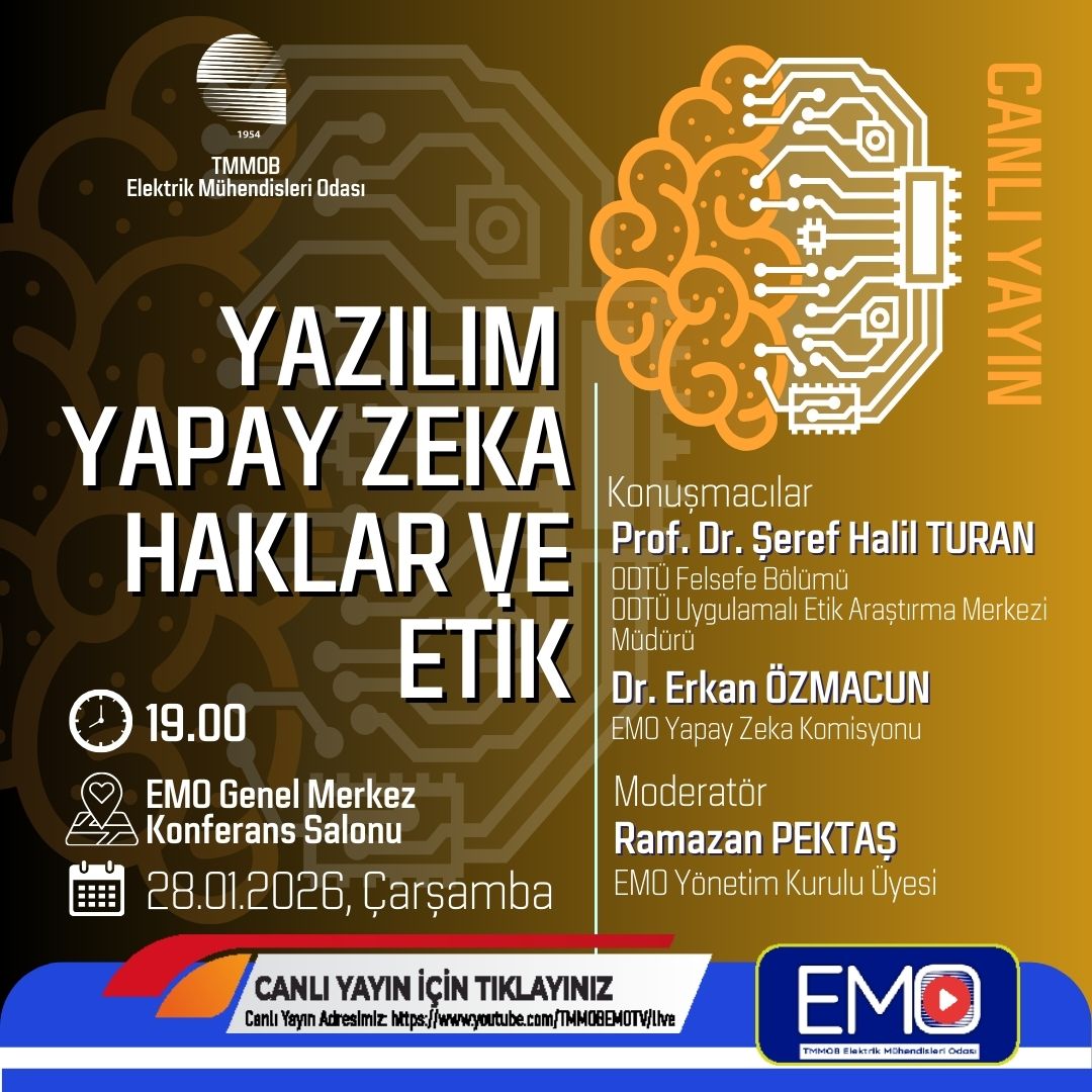 EMO TV’de 28 Ocak 2026 Çarşamba günü “Yazılım, Yapay Zeka, Haklar ve Etik” başlıklı program gerçekleştirilecektir. ODTÜ Felsefe Bölümü Öğretim Üyesi Prof. Dr. Şeref Halil Turan ve Elektrik Mühendisleri Odası Yapay Zeka Komisyonu Üyesi Dr. Erkan Özmacun`un konuşmacı olarak katılacağı program, EMO Yönetim Kurulu Üyesi Ramazan Pektaş`ın yönetiminde düzenlenecektir. Saat 19.00’da başlayacak olan yayına Odamızın Youtube kanalı üzerinden sorularınız ve görüşlerinizle canlı katılabilirsiniz.