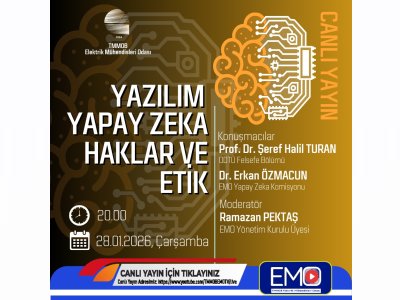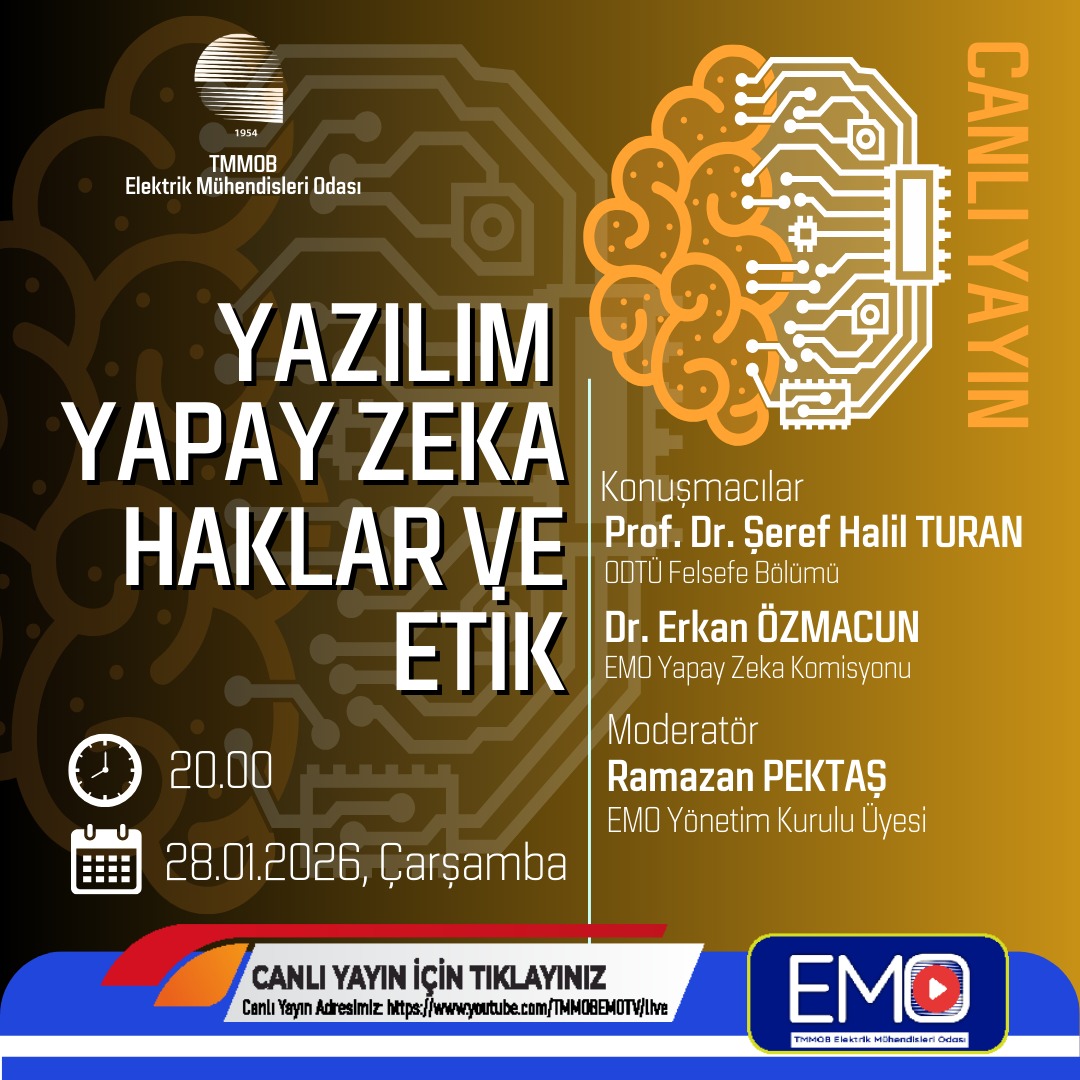 EMO TV’de 28 Ocak 2026 Çarşamba günü “Yazılım, Yapay Zeka, Haklar ve Etik” başlıklı program gerçekleştirilecektir. ODTÜ Felsefe Bölümü Öğretim Üyesi Prof. Dr. Şeref Halil Turan ve Elektrik Mühendisleri Odası Yapay Zeka Komisyonu Üyesi Dr. Erkan Özmacun`un konuşmacı olarak katılacağı program, EMO Yönetim Kurulu Üyesi Ramazan Pektaş`ın yönetiminde düzenlenecektir. Saat 20.00’de başlayacak olan yayına Odamızın Youtube kanalı üzerinden sorularınız ve görüşlerinizle canlı katılabilirsiniz.
