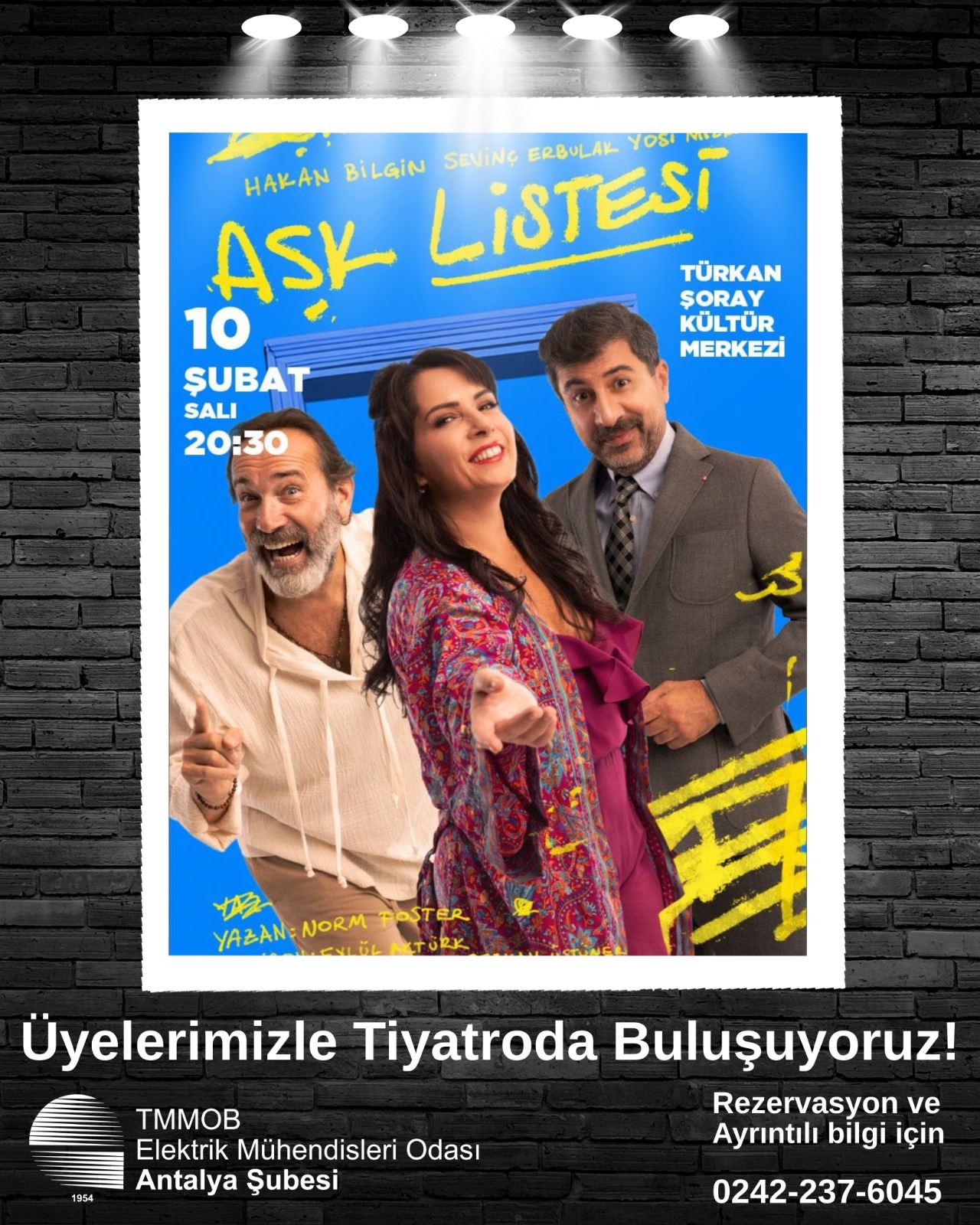 Şube Sosyal Etkinliklerimiz kapsamında 10 Şubat 2026 Salı günü saat 20:30’da Türkan Şoray Kültür Merkezi’nde sahnelenecek olan AŞK LİSTESİ adlı tiyatro oyununa üyelerimizle birlikte gidiyoruz! Serkan Üstüner rejisi ile Sevinç Erbulak, Hakan Bilgin ve Yosi Mizrahi’yi aynı sahnede buluşturan komedi oyunu için bilet almak isteyen üyemizin şubemiz ile iletişime geçmesi rica olunur. (Not: Üyelerimize özel bilet fiyatı 200 TL’dir ve etkinlik kontenjanı sınırlı sayıdadır.)