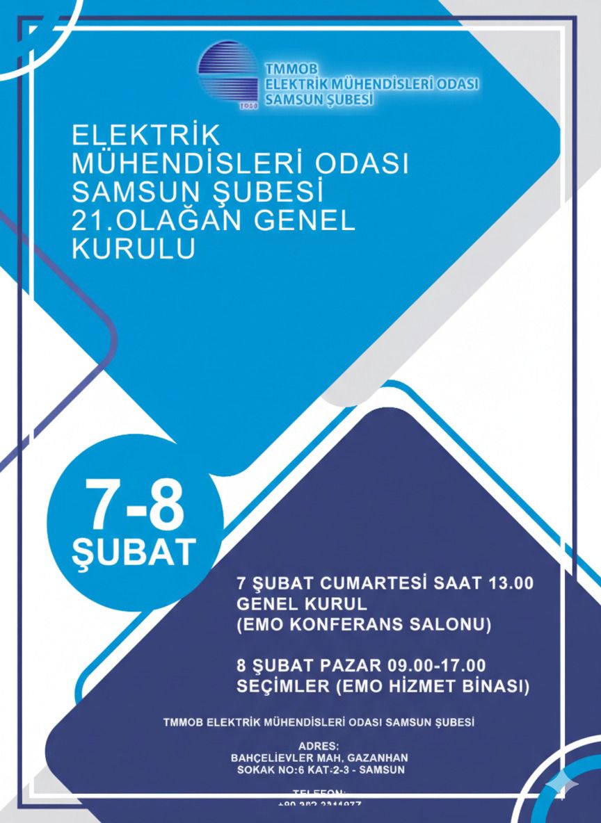 Şubemiz 21. Olağan Genel Kurulu 7 Şubat 2026 Cumartesi günü saat 13.00 ‘de EMO Samsun Şube Konferans salonunda yapılacaktır. Oy kullanma işlemi ise 8 Şubat 2026 Pazar günü saat 09.00-17.00 arasında EMO Samsun Şube Hizmet Binamızda gerçekleştirilecektir. Üyelerimize önemle duyurulur.