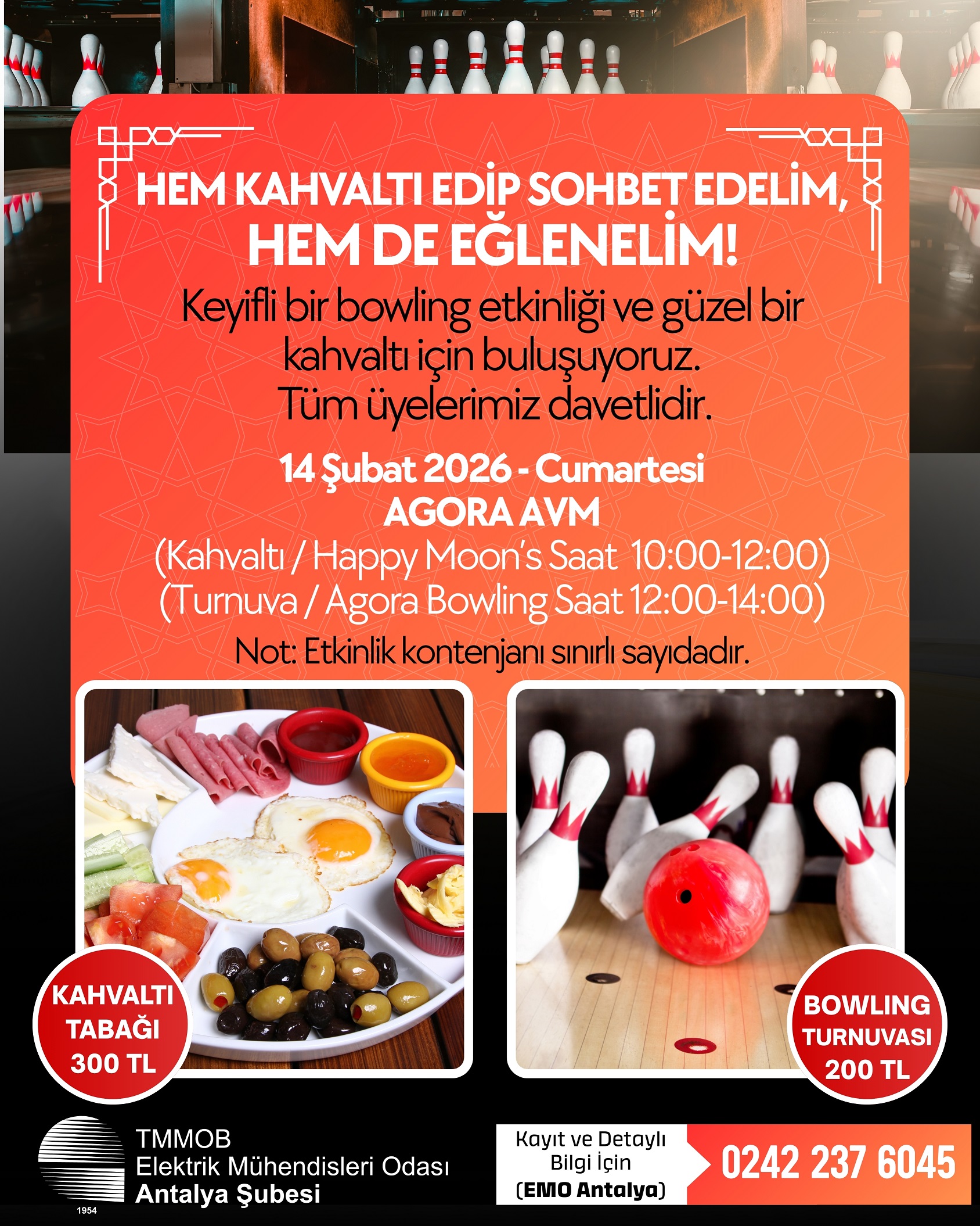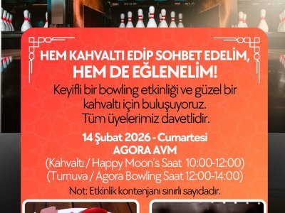 Üyelerimize özel 14 Şubat 2026 Cumartesi günü saat 10:00`da Agora AVM Happy Moon’s Cafe’de kahvaltı ve ardından bowling etkinliği düzenlenecektir. Kontenjanı sınırlı olan etkinliğimize katılmak isteyen üyelerimizin Şubemize isim yazdırmaları önemle rica olunur. (Kahvaltı Ücreti: 300TL/kişi, Bowling Ücreti: 200TL/kişi) (Adres: Agora AVM, Altınova Sinan Mah. Kepez/ANTALYA)