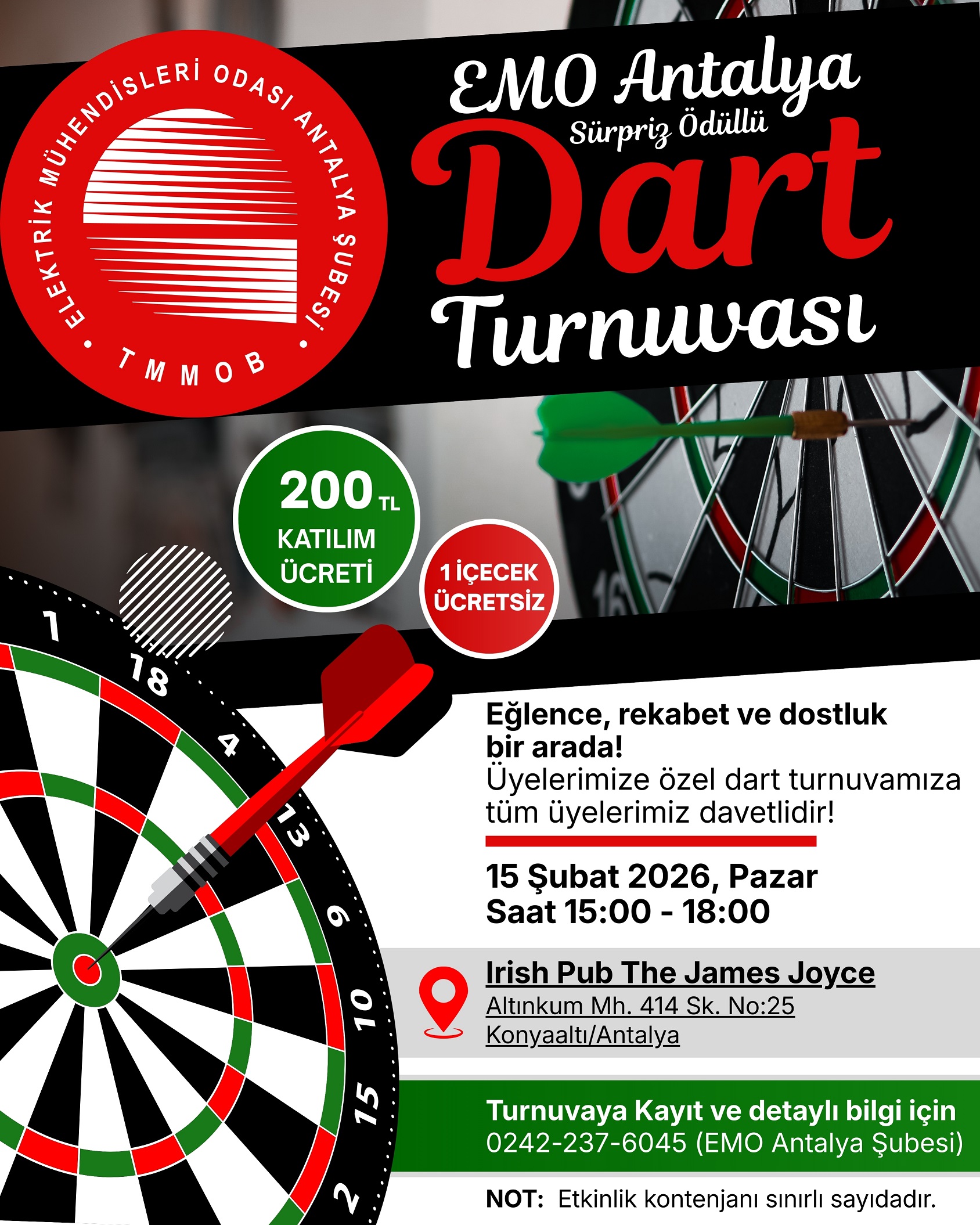 15 Şubat 2026 Pazar günü 15:00-18:00 saatleri arasında Altınkum Mh. 414 Sk. No:25 Konyaaltı/Antalya adresinde bulunan Irish Pub The James Joyce`de üyelerimize özel dart turnuvası etkinliği düzenlenecektir. Kontenjanı sınırlı olan etkinliğimize katılmak isteyen üyelerimizin Şubemize isim yazdırmaları önemle rica olunur. (Katılım ücreti: 200TL/kişi olup katılımcılara 1 adet içecek ücretsiz olarak ikram edilecektir.)
