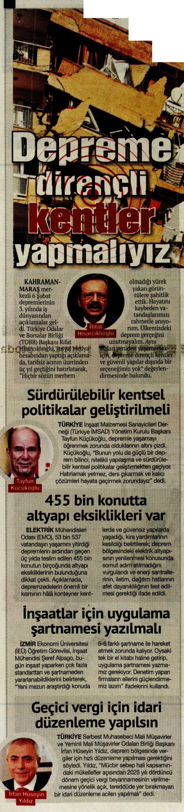 Türkiye İnşaat Malzemesi Sanayicileri Derneği (Türkiye İMSAD) Yönetim Kurulu Başkanı Tayfun Küçükoğlu, depremle yaşamayı öğrenmek zorunda olduklarının altını çizdi. Küçükoğlu, "Bunun yolu da güçlü bir deprem bilinci, nitelikli yapılaşma ve sürdürülebilir kentsel politikalar geliştirmekten geçiyor. Hatırlamak yetmez, ders çıkarmak ve kalıcı çözümleri hayata geçirmek zorundayız" dedi.