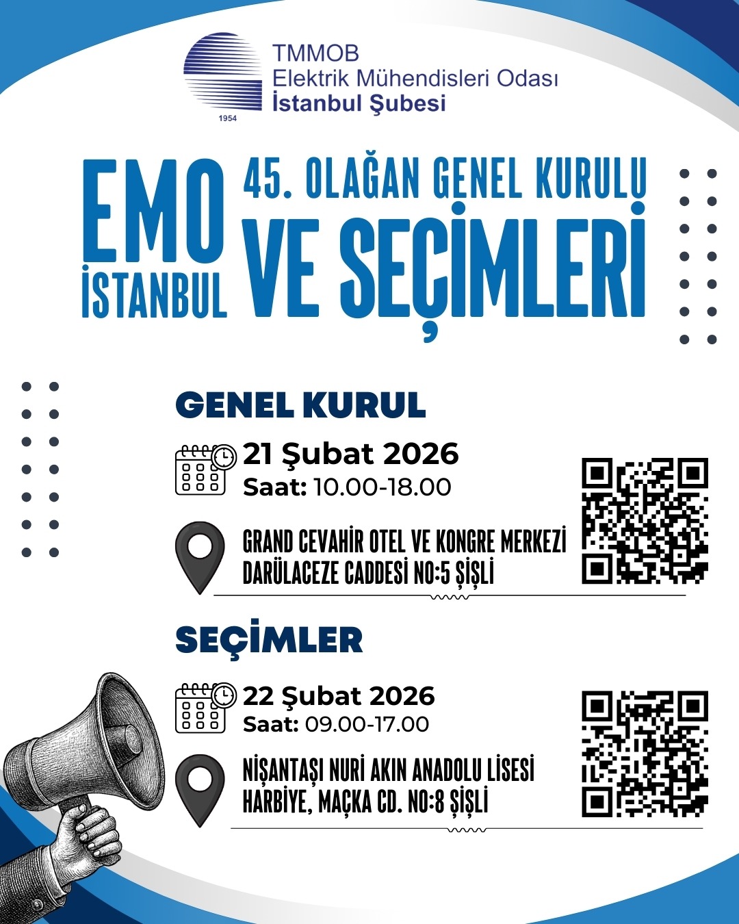 TMMOB Elektrik Mühendisleri Odası İstanbul Şubesi`nin 45. Olağan Genel Kurulu ve Seçimleri gerçekleştiriliyor. 📌 Genel Kurul 🗓 21 Şubat 2026 | ⏰ 10.00–18.00 📍 Grand Cevahir Otel ve Kongre Merkezi – Şişli 📌 Seçimler 🗓 22 Şubat 2026 | ⏰ 09.00–17.00 📍 Nişantaşı Nuri Akın Anadolu Lisesi – Şişli Mesleğimizin geleceğini birlikte inşa etmek için tüm üyelerimizi Genel Kurul ve Seçimlere katılmaya davet ediyoruz.