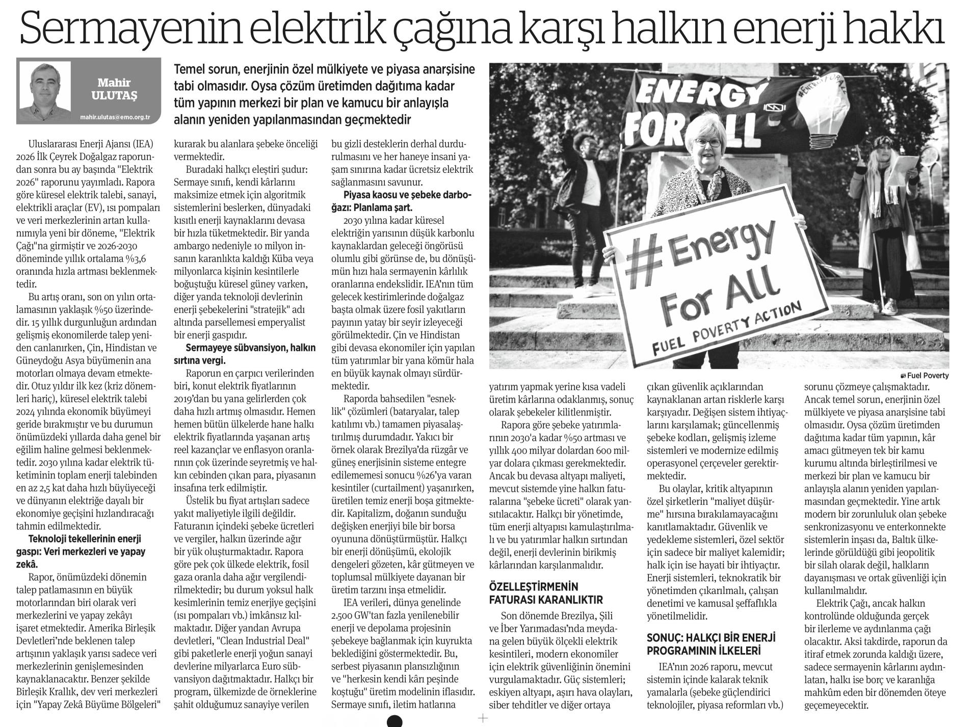 Uluslararası Enerji Ajansı (IEA) 2026 İlk Çeyrek Doğalgaz raporundan sonra bu ay başında "Elektrik 2026" raporunu yayımladı. Rapora göre küresel elektrik talebi, sanayi, elektrikli araçlar (EV), ısı pompaları ve veri merkezlerinin artan kullanımıyla yeni bir döneme, "Elektrik Çağı"na girmiştir ve 2026-2030 döneminde yıllık ortalama %3,6 oranında hızla artması beklenmektedir. Bu artış oranı, son on yılın ortalamasının yaklaşık %50 üzerindedir. 15 yıllık durgunluğun ardından gelişmiş ekonomilerde talep yeniden canlanırken, Çin, Hindistan ve Güneydoğu Asya büyümenin ana motorları olmaya devam etmektedir. Otuz yıldır ilk kez (kriz dönemleri hariç), küresel elektrik talebi 2024 yılında ekonomik büyümeyi geride bırakmıştır ve bu durumun önümüzdeki yıllarda daha genel bir eğilim haline gelmesi beklenmektedir. 2030 yılma kadar elektrik tüketiminin toplam enerji talebinden en az 2,5 kat daha hızlı büyüyeceği ve dünyanın elektriğe dayalı bir ekonomiye geçişini hızlandıracağı tahmin edilmektedir. Teknoloji tekellerinin enerji gaspı: Veri merkezleri ve yapay zekâ. Rapor, önümüzdeki dönemin talep patlamasının en büyük motorlarından biri olarak veri merkezlerini ve yapay zekâyı işaret etmektedir. Amerika Birleşik Devletleri‘nde beklenen talep artışının yaklaşık yarısı sadece veri merkezlerinin genişlemesinden kaynaklanacaktır. Benzer şekilde Birleşik Krallık, dev veri merkezleri için "Yapay Zekâ Büyüme Bölgeleri" kurarak bu alanlara şebeke önceliği vermektedir. Buradaki halkçı eleştiri şudur: Sermaye sınıfı, kendi kârlarını maksimize etmek için algoritmik sistemlerini beslerken, dünyadaki kısıtlı enerji kaynaklarını devasa bir hızla tüketmektedir. Bir yanda ambargo nedeniyle 10 milyon insanın karanlıkta kaldığı Küba veya milyonlarca kişinin kesintilerle boğuştuğu küresel güney varken, diğer yanda teknoloji devlerinin enerji şebekelerini "stratejik" adı altında parsellemesi emperyalist bir enerji gaspıdır. Sermayeye sübvansiyon, halkın sırtına vergi. Raporun en çarpıcı verilerinden biri, konut elektrik fiyatlarının 2019‘dan bu yana gelirlerden çok daha hızlı artmış olmasıdır. Hemen hemen bütün ülkelerde hane halkı elektrik fiyatlarında yaşanan artış reel kazançlar ve enflasyon oranlarının çok üzerinde seyretmiş ve halkın cebinden çıkan para, piyasanın insafına terk edilmiştir. Üstelik bu fiyat artışları sadece yakıt maliyetiyle ilgili değildir. Faturanın içindeki şebeke ücretleri ve vergiler, halkın üzerinde ağır bir yük oluşturmaktadır. Rapora göre pek çok ülkede elektrik, fosil gaza oranla daha ağır vergilendirilmektedir; bu durum yoksul halk kesimlerinin temiz enerjiye geçişini (ısı pompaları vb.) imkânsız kılmaktadır. Diğer yandan Avrupa devletleri, "Clean Industrial Deal" gibi paketlerle enerji yoğun sanayi devlerine milyarlarca Euro sübvansiyon dağıtmaktadır. Halkçı bir program, ülkemizde de örneklerine şahit olduğumuz sanayiye verilen bu gizli desteklerin derhal durdurulmasını ve her haneye insani yaşam sınırına kadar ücretsiz elektrik sağlanmasını savunur. Piyasa kaosu ve şebeke darboğazı: Planlama şart. 2030 yılma kadar küresel elektriğin yarısının düşük karbonlu kaynaklardan geleceği öngörüsü olumlu gibi görünse de, bu dönüşümün hızı hala sermayenin kârlılık oranlarına endekslidir. IEA‘nm tüm gelecek kestirimlerinde doğalgaz başta olmak üzere fosil yakıtların payının yatay bir seyir izleyeceği görülmektedir. Çin ve Hindistan gibi devasa ekonomiler için yapılan tüm yatırımlar bir yana kömür hala en büyük kaynak olmayı sürdürmektedir. Raporda bahsedilen "esneklik" çözümleri (bataryalar, talep katılımı vb.) tamamen piyasalaştırılmış durumdadır. Yakıcı bir örnek olarak Brezilya‘da rüzgâr ve güneş enerjisinin sisteme entegre edilememesi sonucu %26‘ya varan kesintiler (curtailment) yaşanırken, üretilen temiz enerji boşa gitmektedir. Kapitalizm, doğanın sunduğu değişken enerjiyi bile bir borsa oyununa dönüştürmüştür. Halkçı bir enerji dönüşümü, ekolojik dengeleri gözeten, kâr gütmeyen ve toplumsal mülkiyete dayanan bir üretim tarzını inşa etmelidir. IEA verileri, dünya genelinde 2.500 GW‘tan fazla yenilenebilir enerji ve depolama projesinin şebekeye bağlanmak için kuyrukta beklediğini göstermektedir. Bu, serbest piyasanın plansızlığının ve "herkesin kendi kârı peşinde koştuğu" üretim modelinin iflasıdır. Sermaye sınıfı, iletim hatlarına yatırım yapmak yerine kısa vadeli üretim kârlarına odaklanmış, sonuç olarak şebekeler kilitlenmiştir. Rapora göre şebeke yatırımlarının 2030‘a kadar %50 artması ve yıllık 400 milyar dolardan 600 milyar dolara çıkması gerekmektedir. Ancak bu devasa altyapı maliyeti, mevcut sistemde yine halkın faturalarına "şebeke ücreti" olarak yansıtılacaktır. Halkçı bir yönetimde, tüm enerji altyapısı kamulaştırılmalı ve bu yatırımlar halkın sırtından değil, enerji devlerinin birikmiş kârlarından karşılanmalıdır. ÖZELLEŞTİRMENİN FATURASI KARANLIKTIR Son dönemde Brezilya, Şili ve İber Yarımadası‘nda meydana gelen büyük ölçekli elektrik kesintileri, modern ekonomiler için elektrik güvenliğinin önemini vurgulamaktadır. Güç sistemleri; eskiyen altyapı, aşırı hava olayları, siber tehditler ve diğer ortaya çıkan güvenlik açıklarından kaynaklanan artan risklerle karşı karşıyadır. Değişen sistem ihtiyaçlarını karşılamak; güncellenmiş şebeke kodlan, gelişmiş izleme sistemleri ve modernize edilmiş operasyonel çerçeveler gerektirmektedir. Bu olaylar, kritik altyapının özel şirketlerin "maliyet düşürme" hırsına bırakılamayacağını kanıtlamaktadır. Güvenlik ve yedekleme sistemleri, özel s