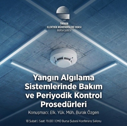 18 Şubat 2026 Çarşamba günü saat 19.00da EMO Bursa Şube Konferans Salonunda Elektrik Yüksek Mühendisi Burak ÖZGEN`nin konuşmacı olacağı Yangın Algılama Sistemlerinde Bakım ve Periyodik Kontrol Prosedürleri konulu bilgilendirme semineri düzenlenecektir.