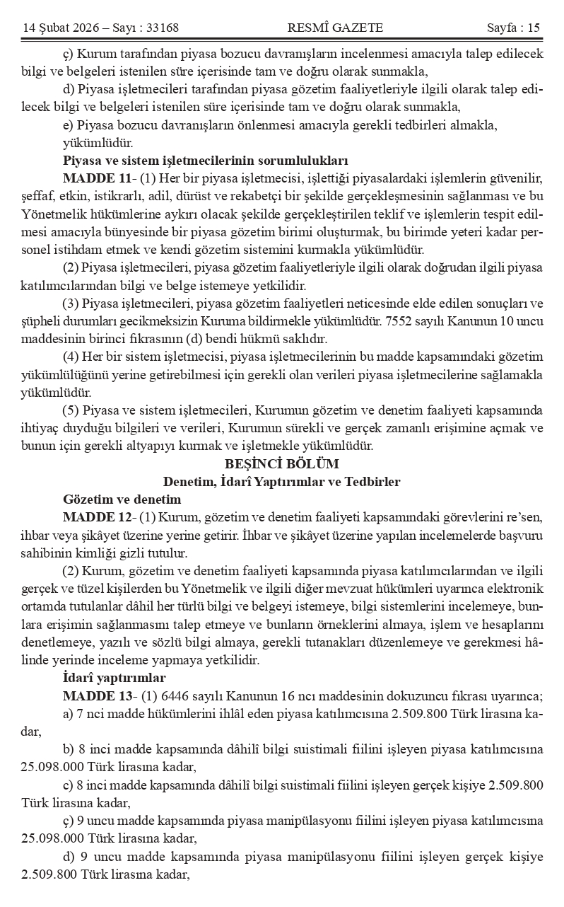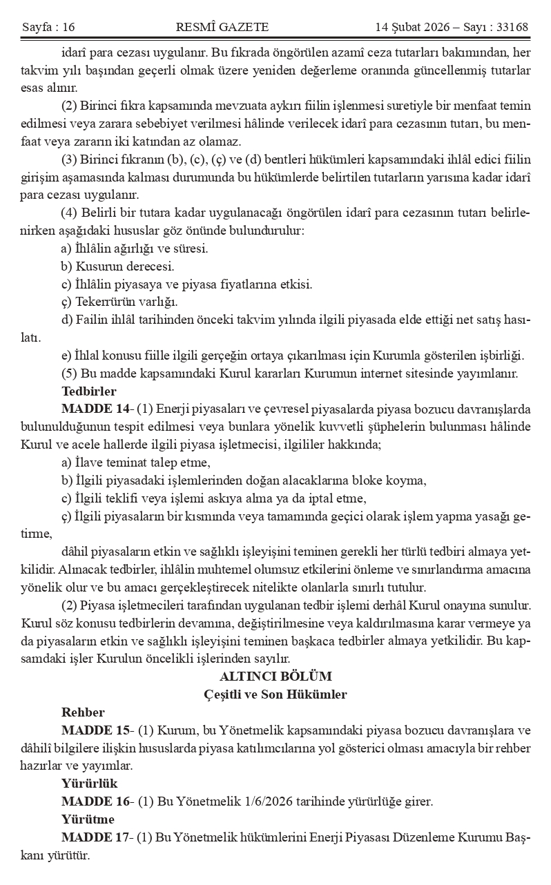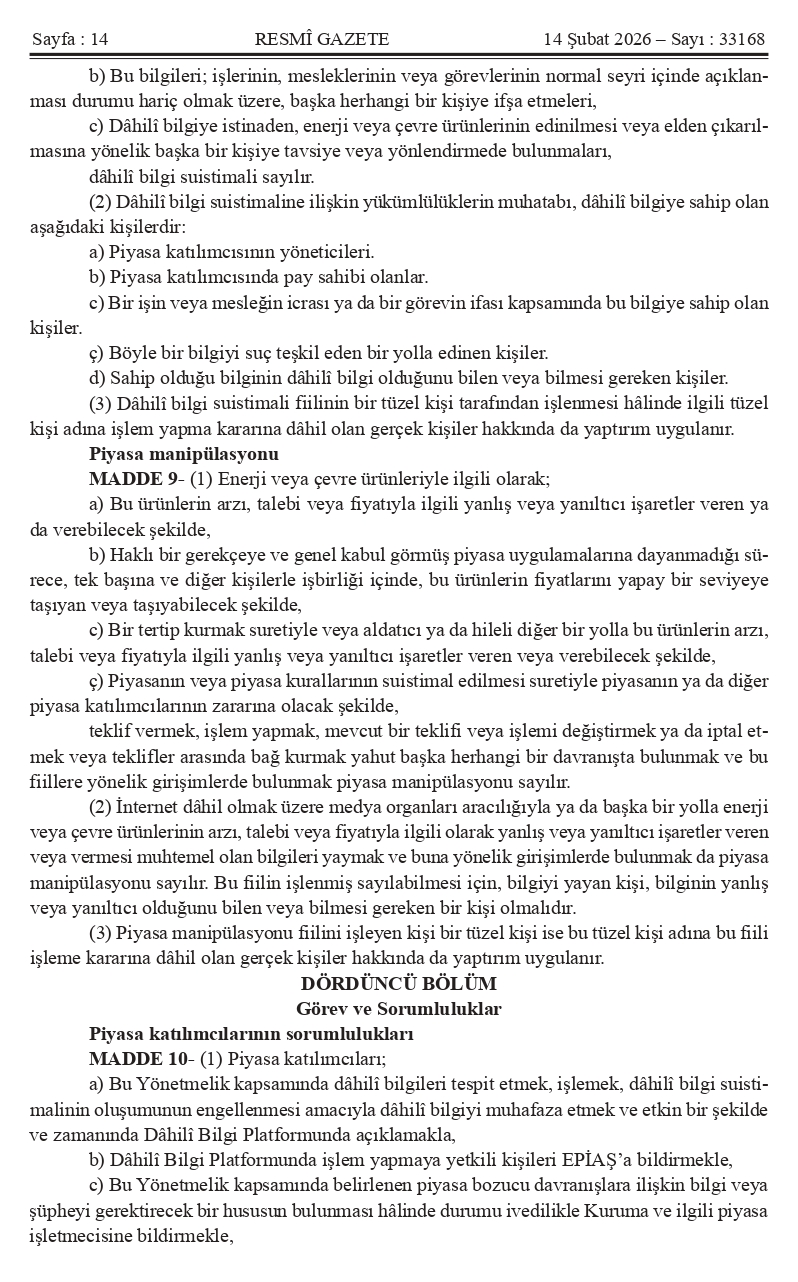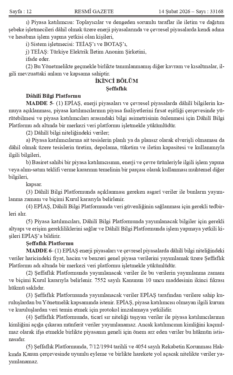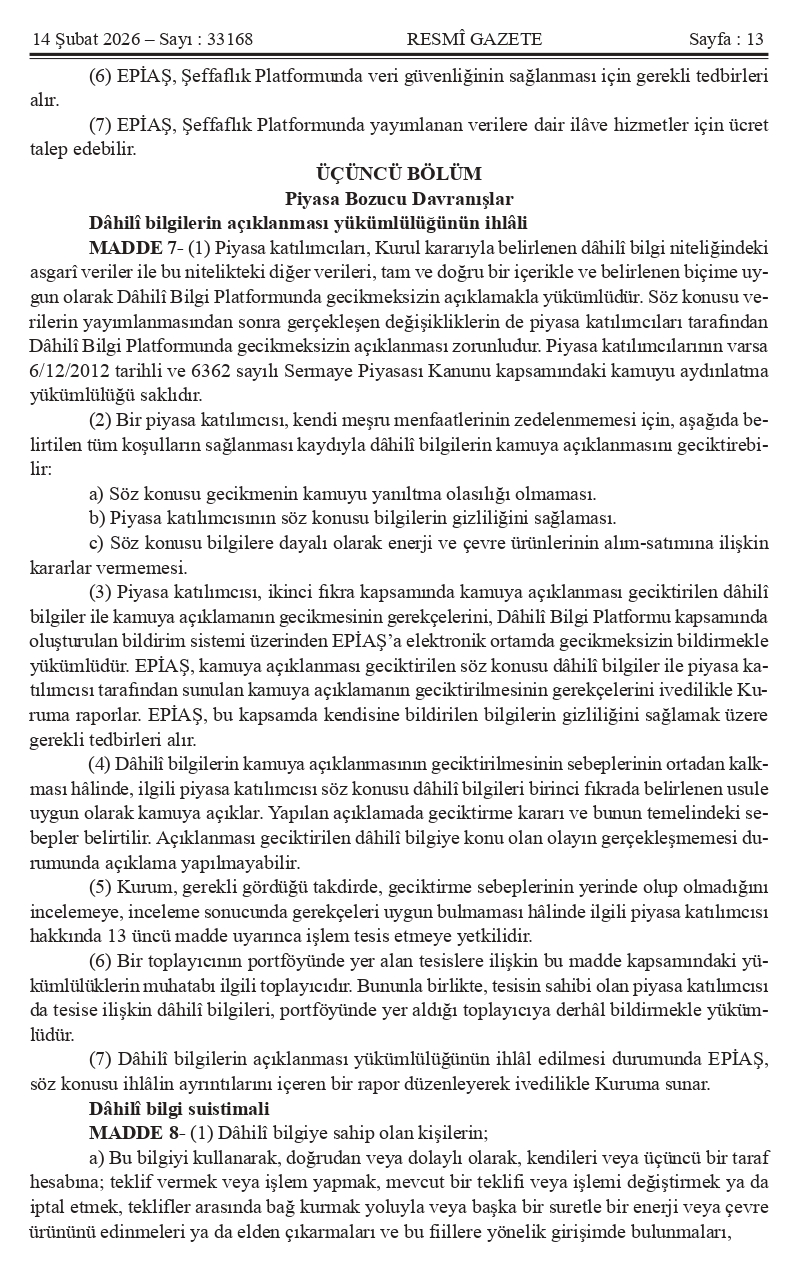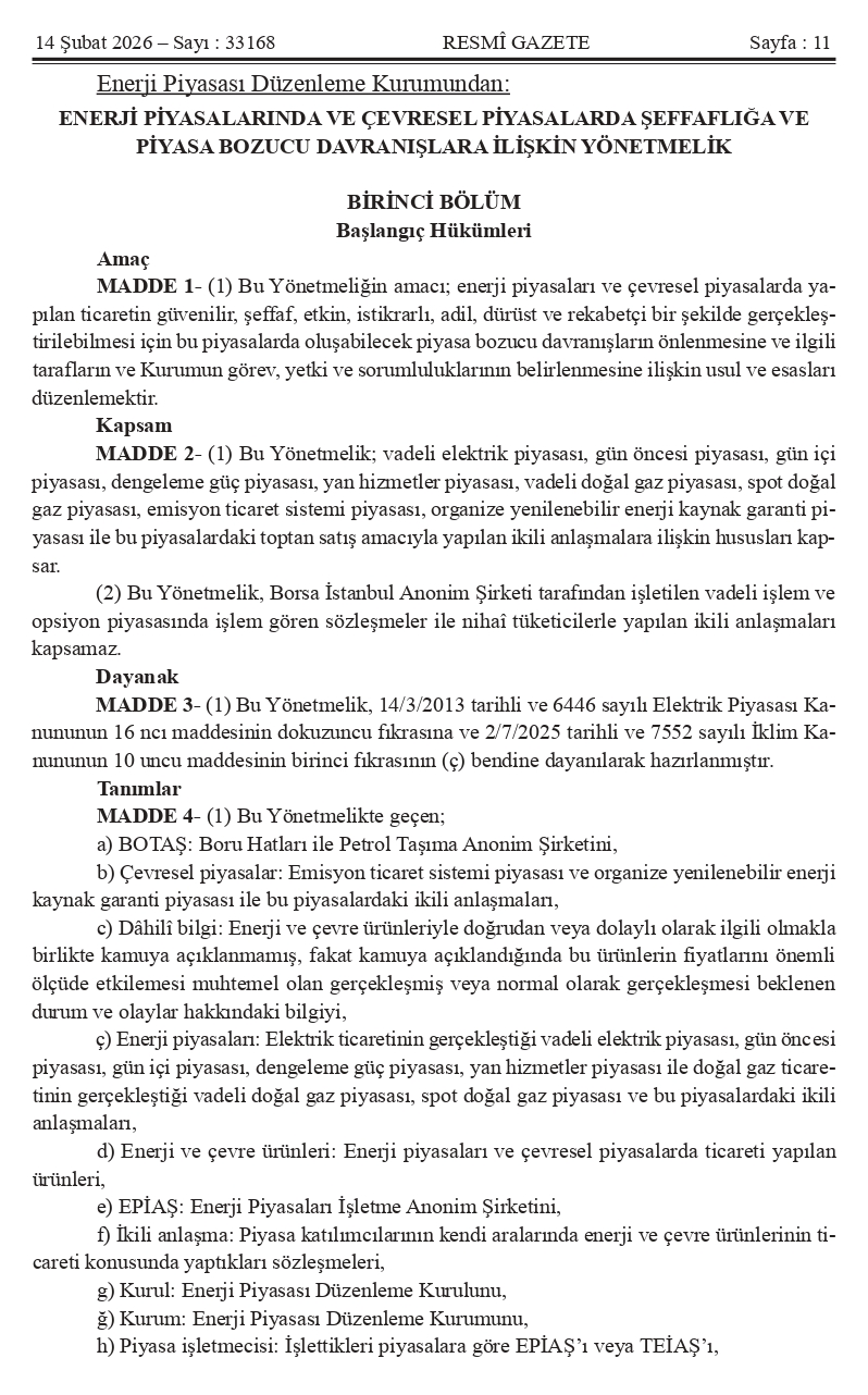 Kıymetli Üyelerimiz, Mevzuat Takip Sistemimiz bilgilendirmesine göre ` ENERJİ PİYASALARINDA VE ÇEVRESEL PİYASALARDA ŞEFFAFLIĞA VE PİYASA BOZUCU DAVRANIŞLARA İLİŞKİN YÖNETMELİK` 14.02.2026 Tarih ve 33168 Sayılı Resmi Gazetede yayımlanmıştır.