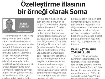 Türkiye‘nin son yirmi yılına damga vuran enerji politikaları, neo-liberal ekonomi programlarının en ağır ve sistematik tahribatına uğrayan alanların başında gelmektedir. Bu süreçte "verimlilik artışı," "teknolojik modernizasyon" ve "ucuz enerji" gibi süslü vaatlerle halkın müşterek varlığı olan elektrik üretim tesisleri birer birer sermaye gruplarına devredilmiştir. Ancak gelinen noktada bu vaatlerin hiçbirinin gerçekleşmediği; aksine halkın fahiş fiyat artışları, devasa boyutlara ulaşan kamusal zararlar ve geri dönülemez çevresel felaketlerle baş başa bırakıldığı görülmektedir. Soma B Termik Santrali‘nin 201 5 yılında başlayan özelleştirilme serüveni ve bugün Soma A için kurulan yeni ihale masası, bu piyasalaştırma dalgasının yarattığı yıkımın en somut ve can yakıcı örneği olarak karşımızda durmaktadır.