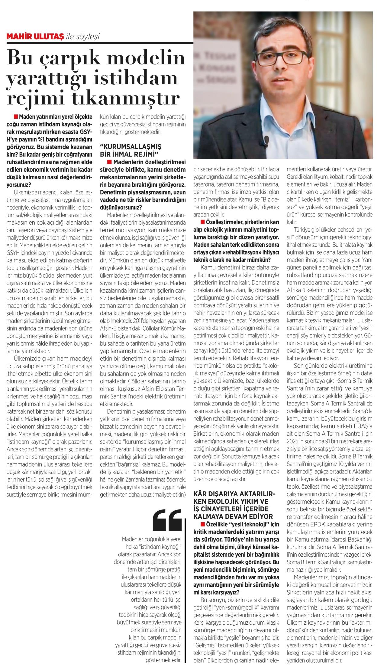 Madenlerimiz, toprağın altındaki değerli kamusal bir servetimizdir. Şirketlerin yalnızca hızlı nakit akışı sağlayan bir kalem olarak gördüğü madenlerimizi, uluslararası sermayenin yağmasından kurtarmamız gerekir. Ülkemiz kaynaklarının bu "aktarım" döngüsünden kurtarılıp; nadir bulunan elementlerin, madenlerimizin ve diğer yeraltı zenginliklerimizin değerlendirileceği rasyonel bir ekonomi politikası yeniden oluşturulmalıdır.