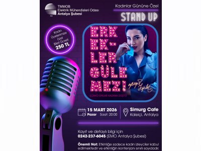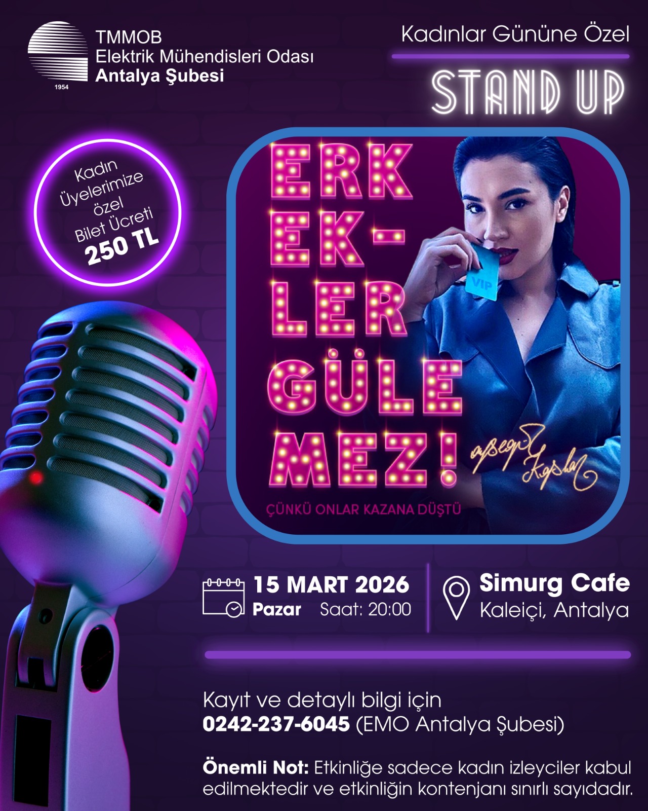 Dünya Kadınlar Günü vesilesiyle 15 Mart 2026-Pazar saat 20:00da Antalya Kaleiçi Simurg Cafede Ayşegül Kaplan tarafından gerçekleştirilecek olan ERKEKLER GÜLEMEZ adlı stand-up gösterisine, üyelerimize özel indirimli 250 TL/kişi bilet almak isteyen kadın üyelerimizin Şubemizle iletişime geçmesi rica olunur.