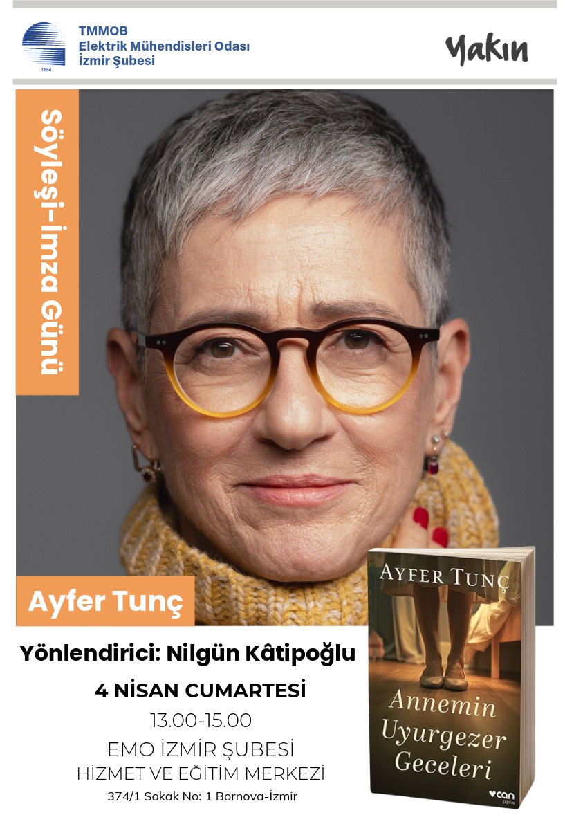 Elektrik Mühendisleri Odası (EMO) İzmir Şubesi ve Yakın Kitabevi iş birliğiyle, edebiyatımızın önemli yazarlarından Ayfer Tunç’un katılımıyla söyleşi ve imza günü etkinliği düzenleniyor. Nilgün Katipoğlu’nun yönlendiriciliğinde 4 Nisan 2026 Cumartesi günü EMO İzmir Şubesi Hizmet ve Eğitim Merkezi’nde gerçekleştirilecek etkinliğe tüm üyelerimiz ve edebiyatseverler davetlidir.
