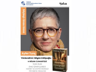 Elektrik Mühendisleri Odası (EMO) İzmir Şubesi ve Yakın Kitabevi iş birliğiyle, edebiyatımızın önemli yazarlarından Ayfer Tunç’un katılımıyla söyleşi ve imza günü etkinliği düzenleniyor. Nilgün Katipoğlu’nun yönlendiriciliğinde 4 Nisan 2026 Cumartesi günü EMO İzmir Şubesi Hizmet ve Eğitim Merkezi’nde gerçekleştirilecek etkinliğe tüm üyelerimiz ve edebiyatseverler davetlidir.
