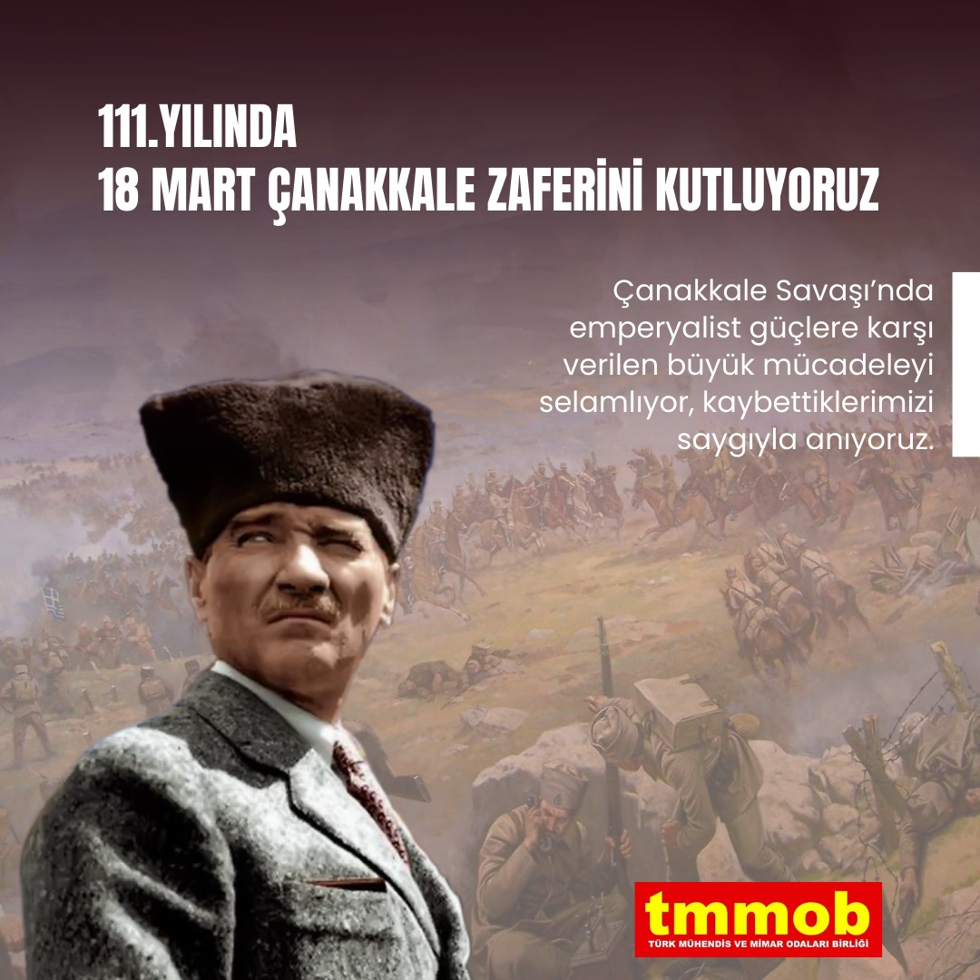 Emperyalist işgale karşı halkın örgütlü direnişiyle yazılan bu büyük mücadelenin 111. yılında, Çanakkale Zaferi’ni selamlıyoruz. TMMOB olarak, bağımsızlık, eşitlik ve özgürlük mücadelesinin tarihsel mirasına sahip çıkmaya devam edeceğiz.