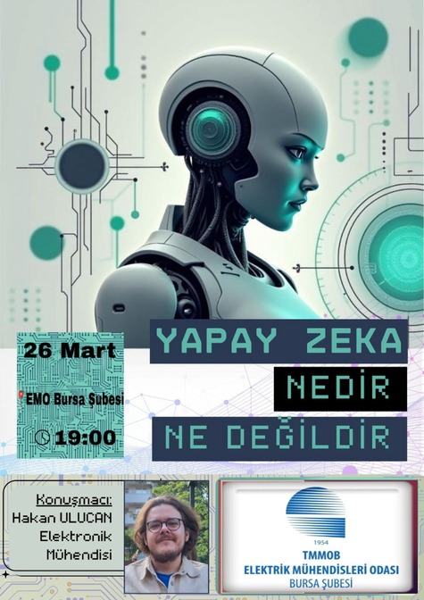 26 Mart 2026 Perşembe günü saat 19.00da EMO Bursa Şube Konferans Salonunda Elektronik Mühendisi Hakan ULUCAN`nın konuşmacı olacağı YAPAY ZEKA NEDİR? NE DEĞİLDİR? konulu seminer düzenlenecektir.