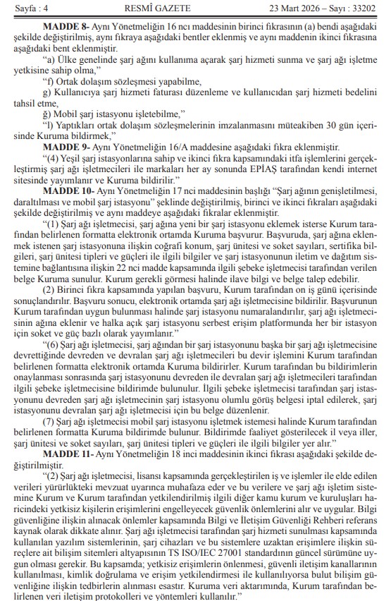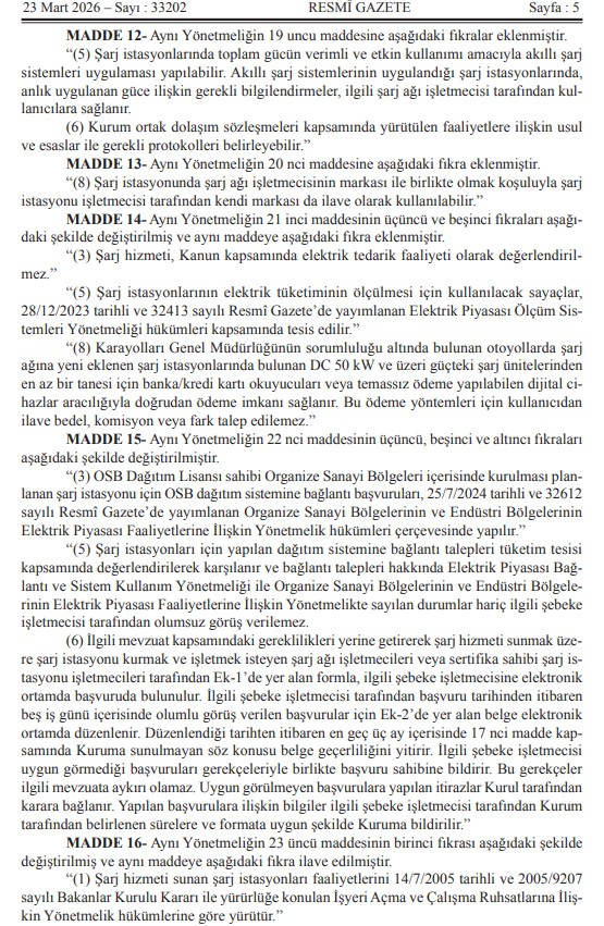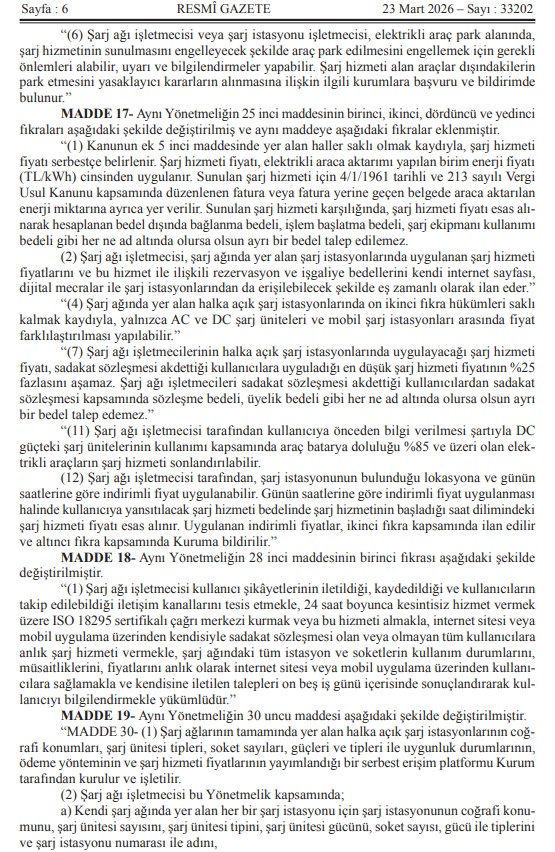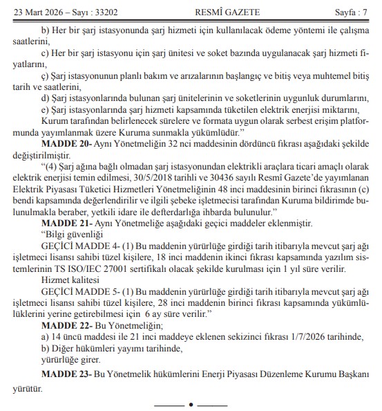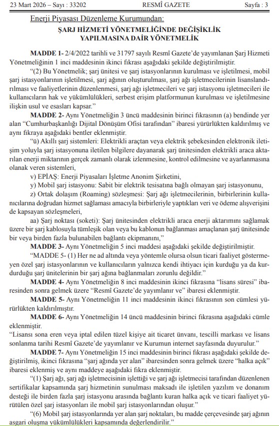 Kıymetli Üyelerimiz, Mevzuat Takip Sistemimiz bilgilendirmesine göre `ŞARJ HİZMETİ YÖNETMELİĞİNDE DEĞİŞİKLİK YAPILMASINA DAİR YÖNETMELİK` 23.03.2026 Tarih ve 33202 Sayılı Resmi Gazetede yayımlanmıştır.