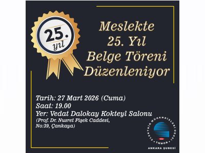 Meslekte 25. Yılını dolduran üyelerimize yönelik olarak 27 Mart 2026 Cuma günü belge töreni düzenleniyor. Vedat Dalokay