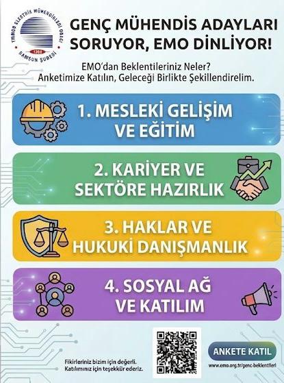 Elektrik Mühendisleri Odası Samsun Şubesi tarafından hazırlanan ``Genç Mühendis Adayları Soruyor,EMO Dinliyor!`` anketimize katılın.Geleceği birlikte şekillendirelim.Yazımızın devamındaki bağlantı linkine tıklayarak anketimize ulaşabilirsiniz.