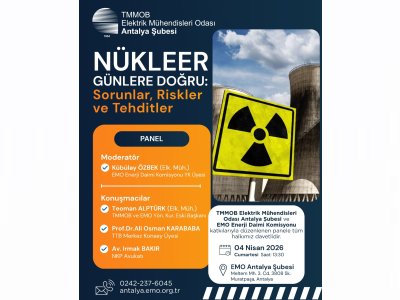 Panel: Nükleer Günlere Doğru: Sorunlar, Riskler ve Tehditler Tarih ve Saat: 04 Nisan 2026 Cumartesi günü Saat 13:30 Yer: EMO Antalya Şubesi Seminer Salonu`nda (Meltem Mah. 3. Cad. 3808 Sk. No: 20 Muratpaşa/Antalya) Moderatör: Kübülay ÖZBEK / EMO Enerji Daimi Komisyonu YK Üyesi Konuşmacılar: Teoman ALPTÜRK / TMMOB ve EMO Yönetim Kurulu Eski Başkanı Prof. Dr. Ali Osman KARABABA / TTB Merkez Konsey Üyesi Av. Irmak BAKIR / NKP Avukatı
