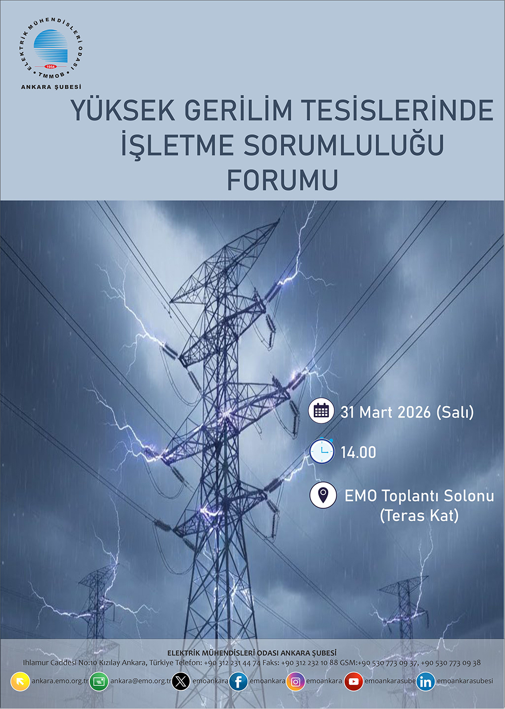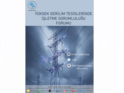 YÜKSEK GERİLİM TESİSLERİNDE İŞLETME SORUMLULUĞU FORUMU Tarih: 31 Mart 2026 Salı Saat: 14.00 Yer: EMO Toplantı Salonu (Ihlamur Caddesi NO:10 Kızılay Ankara)