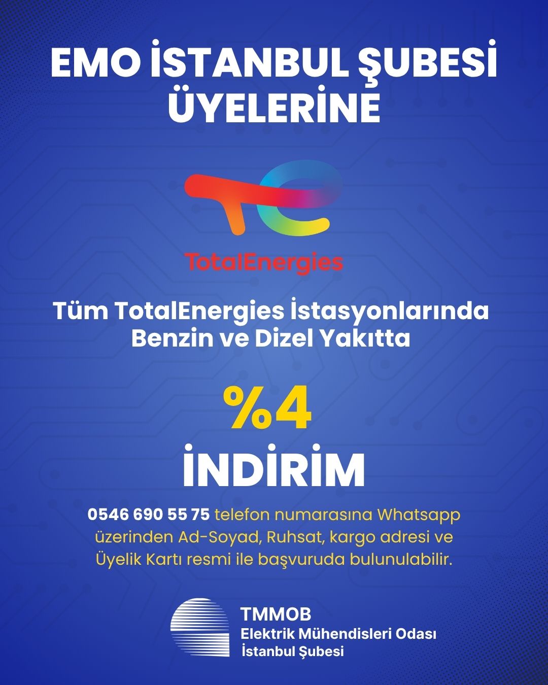 EMO İstanbul Şubesi TotalEnergies arasında imzalanan protokol ile üyelerimize benzin ve dizel yakıtta %4 indirim sağlanmıştır.