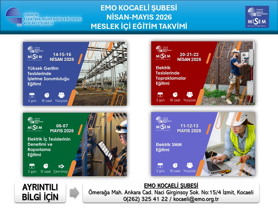EMO Kocaeli Şubesi tarafından düzenlenecek Nisan-Mayıs 2026 dönemlerine ait meslek içi eğitim takvimi yayınlandı. 🔹 Yüksek Gerilim Tesislerinde İşletme Sorumluluğu Eğitimi 🗓️ 14-15-16 Nisan 2026 📍 Şube Eğitim Salonu ⏰ 10.00-17.00 🔹 Elektrik Tesislerinde Topraklamalar Eğitimi 🗓️ 20-21-22 Nisan 2026 📍 Şube Eğitim Salonu ⏰ 10.00-17.00 🔹 Elektrik İç Tesislerinin Denetimi ve Raporlama Eğitimi 🗓️ 6-7 Mayıs 2026 📍 Çevrimiçi ⏰ 10.00-17.00 🔹 Elektrik SMM Eğitimi 🗓️ 11-12-13 Mayıs 2026 📍 Şube Eğitim Salonu ⏰ 10.00-17.00 Kayıt işlemleri ve detaylı bilgi için şubemizle iletişime geçebilirsiniz. MİSEM Eğitimlerine Başvuru ve Kayıt İçin; https://portal.emo.org.tr/egitimler İLETİŞİM TMMOB Elektrik Mühendisleri Odası Kocaeli Şubesi Ömerağa Mahallesi Naci Girginsoy Sokak No:15/4 KOCAELİ Tel: 0262.325 41 22 e-posta: kocaeli@emo.org.tr web: http://kocaeli.emo.org.tr/