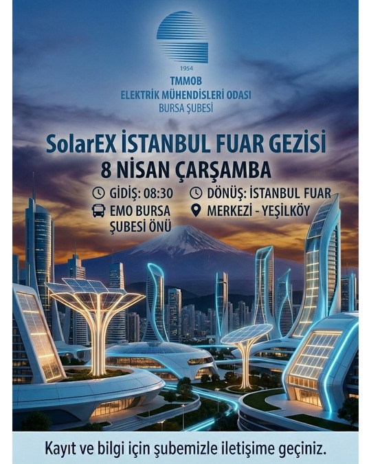 8 Nisan 2026 Çarşamba günü İstanbul Fuar Merkezinde ULUSLARARASI SOLAREX 2026 GÜNEŞ ENERJİSİ VE GÜNEŞ TEKNOLOJİSİ FUARI` na teknik gezi düzenlenecektir. Katılmak isteyen üyelerimizin 7 Nisan 2026 Salı günü mesai bitimine kadar Şubeye veya bağlı bulundukları Temsilciliklere bildirmelerini rica ederiz.