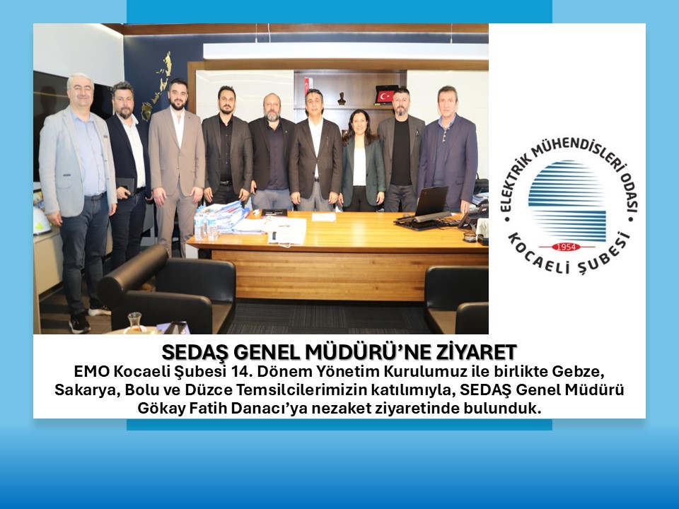 Elektrik Mühendisleri Odası Kocaeli Şubesi 14. Dönem Yönetim Kurulumuz ile birlikte Gebze, Sakarya, Bolu ve Düzce Temsilcilerimizin katılımıyla, SEDAŞ Genel Müdürü Gökay Fatih Danacı’ya nezaket ziyaretinde bulunduk.