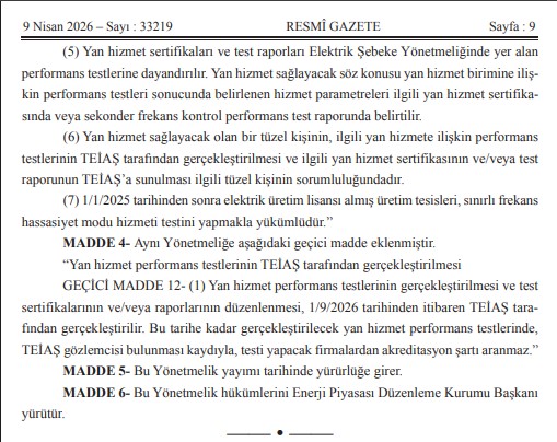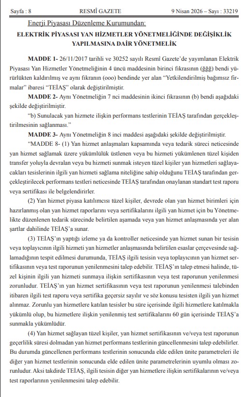 Kıymetli Üyelerimiz, Mevzuat Takip Sistemimiz bilgilendirmesine göre `ELEKTRİK PİYASASI YAN HİZMETLER YÖNETMELİĞİNDE DEĞİŞİKLİK YAPILMASINA DAİR YÖNETMELİK` 09.04.2026 Tarih ve 33219 Sayılı Resmi Gazetede yayımlanmıştır.