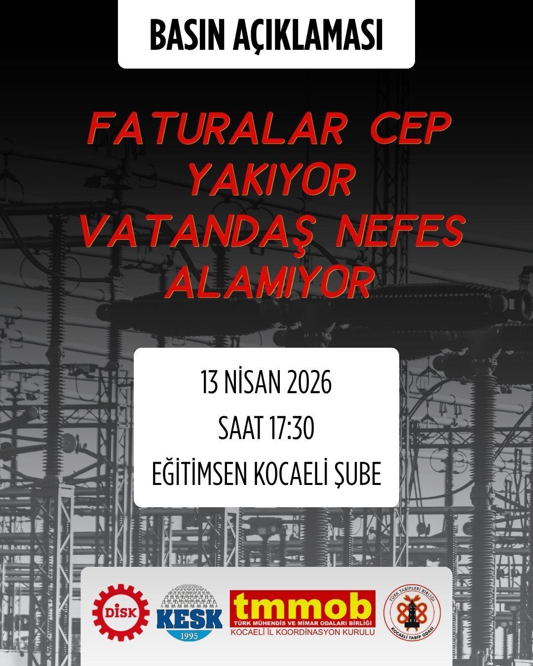 DİSK, KESK, TMMOB ve TTB Kocaeli bileşenleri, Enerji Piyasası Düzenleme Kurumu’nun yürürlüğe giren kararıyla konut elektrik tarifelerine yapılan yüzde 25`lik zam ve piyasa takas fiyatlarına yapılan zamlar ve dağıtım kalemlerindeki %30 zamma karşı basın açıklaması gerçekleştirecektir.