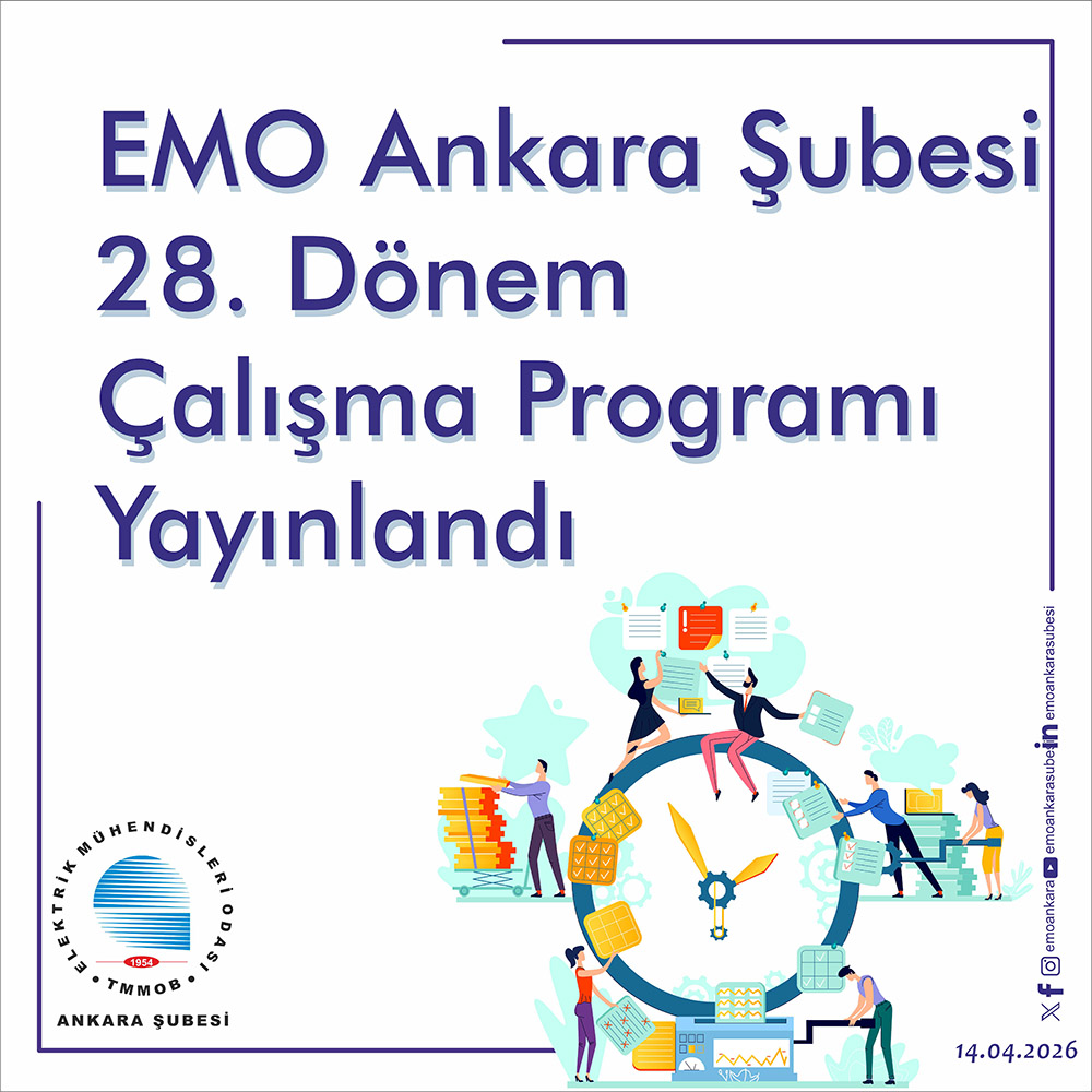 Elektrik Mühendisleri Odası (EMO) Ankara Şubesi’nin 7-8 Şubat 2026 tarihlerinde gerçekleştirilen 28. Olağan Genel Kurul süreçlerinde tartışılan ve kabul gören yaklaşımlar çerçevesinde önceki dönemlerin birikimleri ışığında, EMO Ankara Şubesi 28. Dönem Yönetim Kurulu tarafından Şubenin ilgili organları ile ortaklaşarak hazırlanan Çalışma Programı ile Şubenin, Odanın ve TMMOB’nin örgütsel bütünlük çerçevesinde dönem çalışmalarının gerçekleştirilmesi hedeflenmektedir. Bu bakış açısıyla hazırlanan “EMO Ankara Şubesi 28. Dönem Çalışma Programı” Şubenin 09/04/2026 tarih ve 28/10 sayılı Yönetim Kurulu toplantısında oy birliği ile kabul edilmiştir.